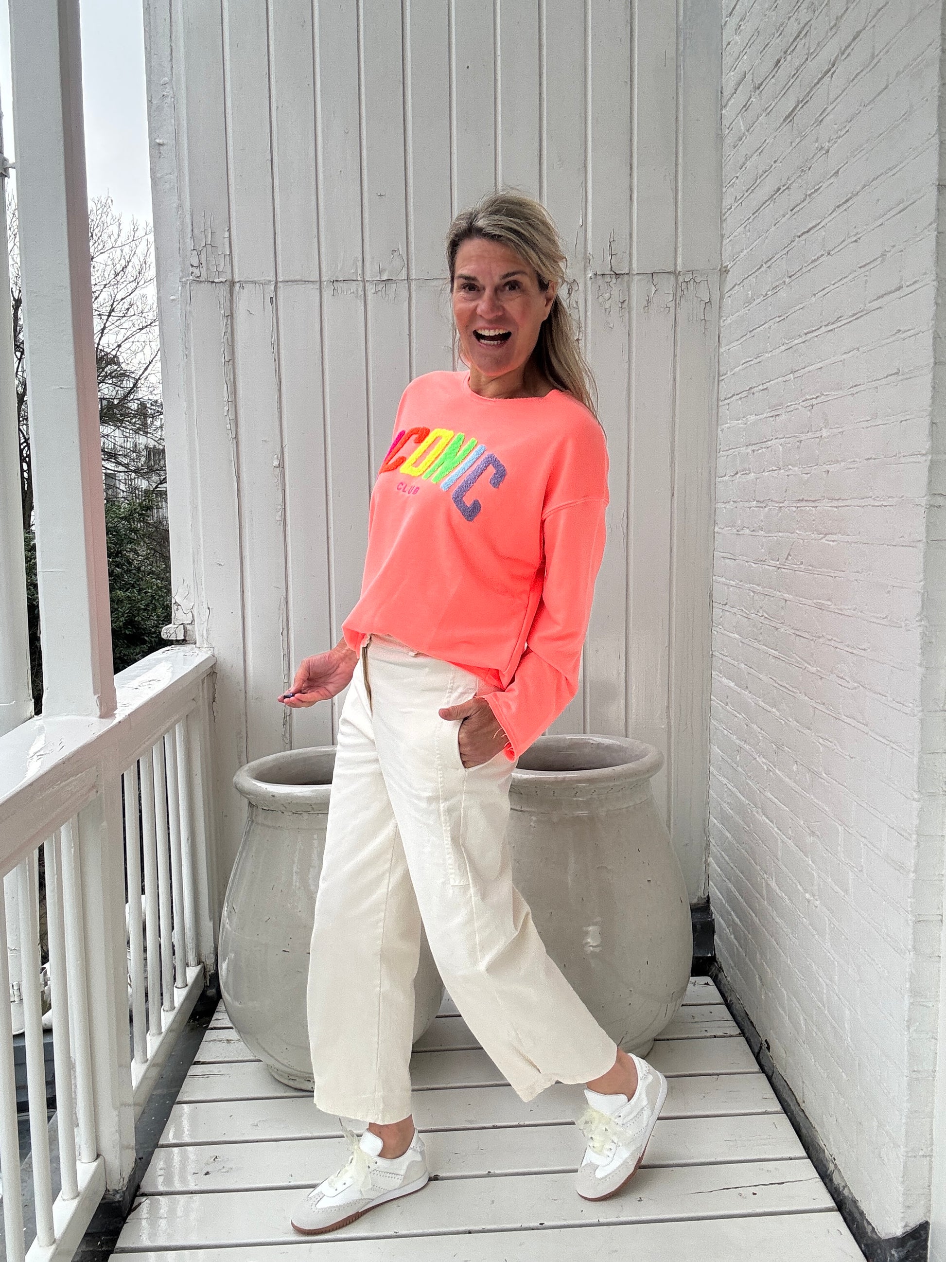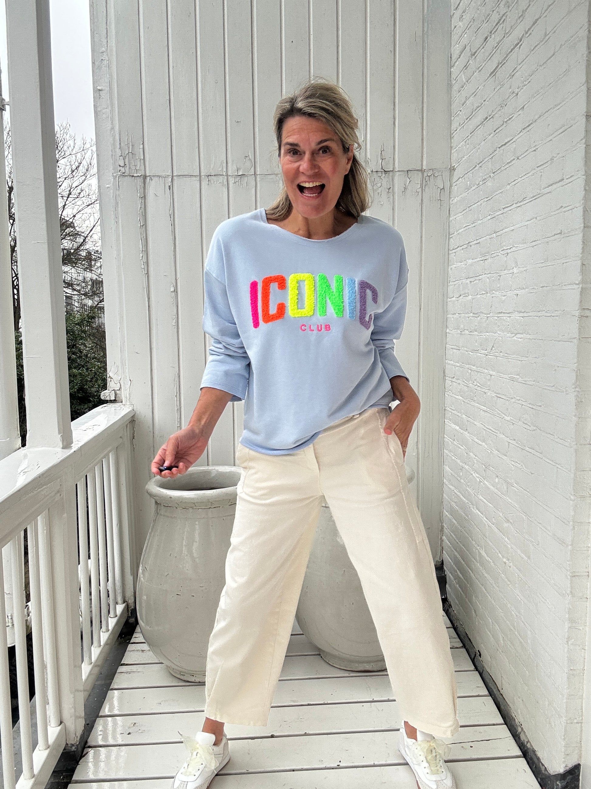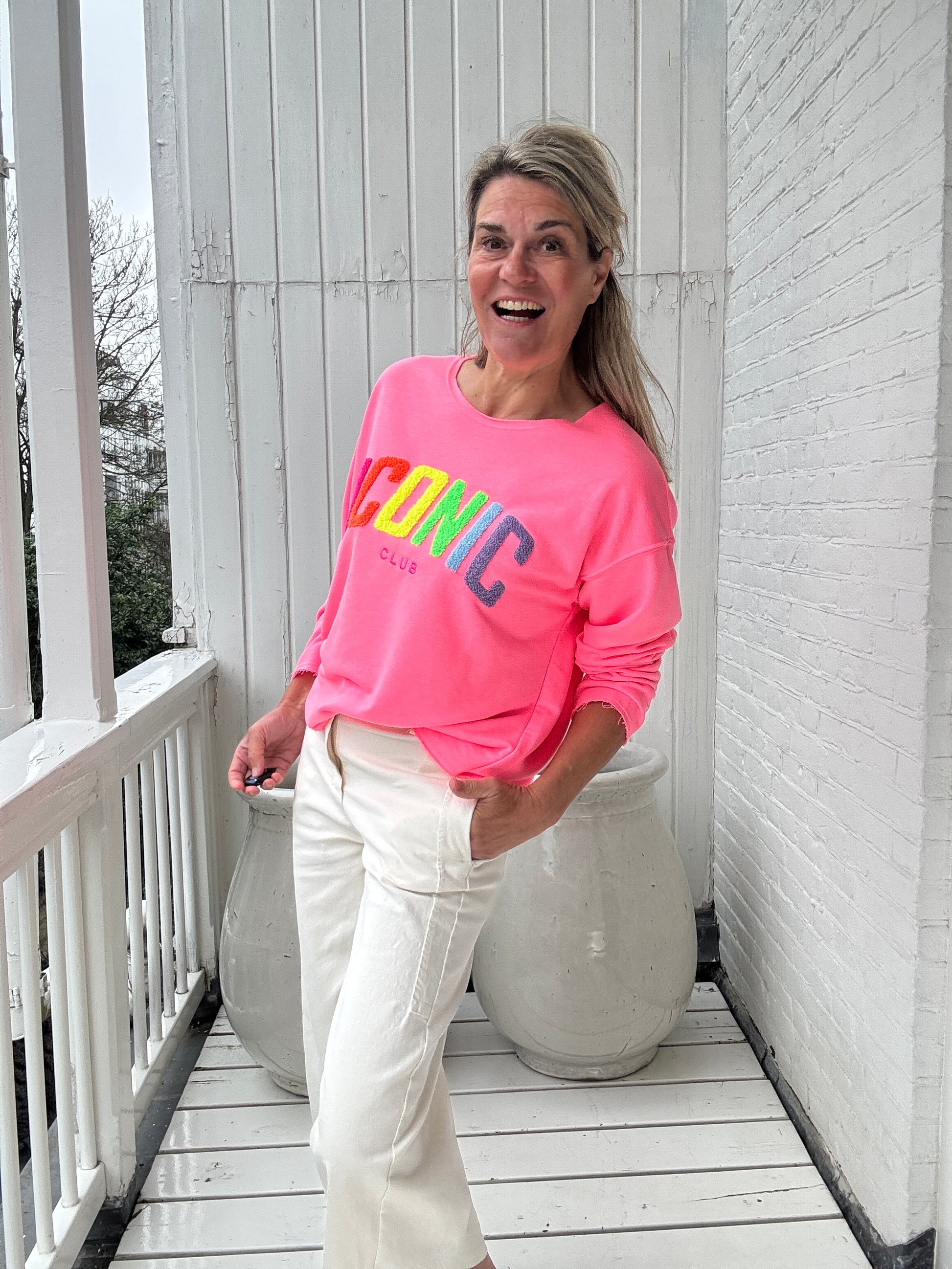 Deze sweater straalt vrolijkheid uit! De Iconic letters in de vrolijke regenboogkleuren zijn uitgevoerd in een zachte badstof finish en de sweater en de sweater is afgewerkt met een licht gerafeld randje dat elegant stopt bij het stiksel. Met deze sweater hoor je ook bij onze Iconic Club!