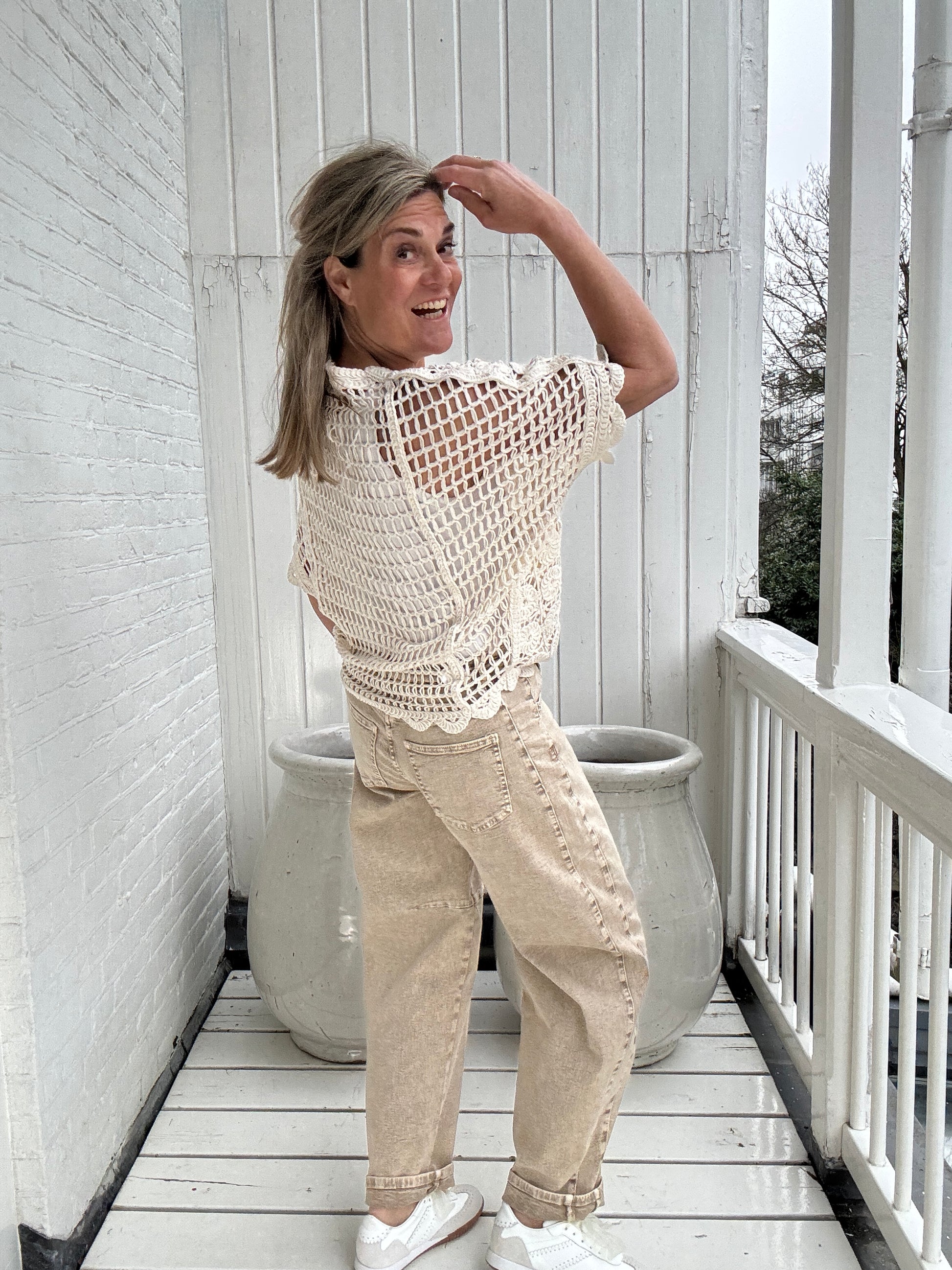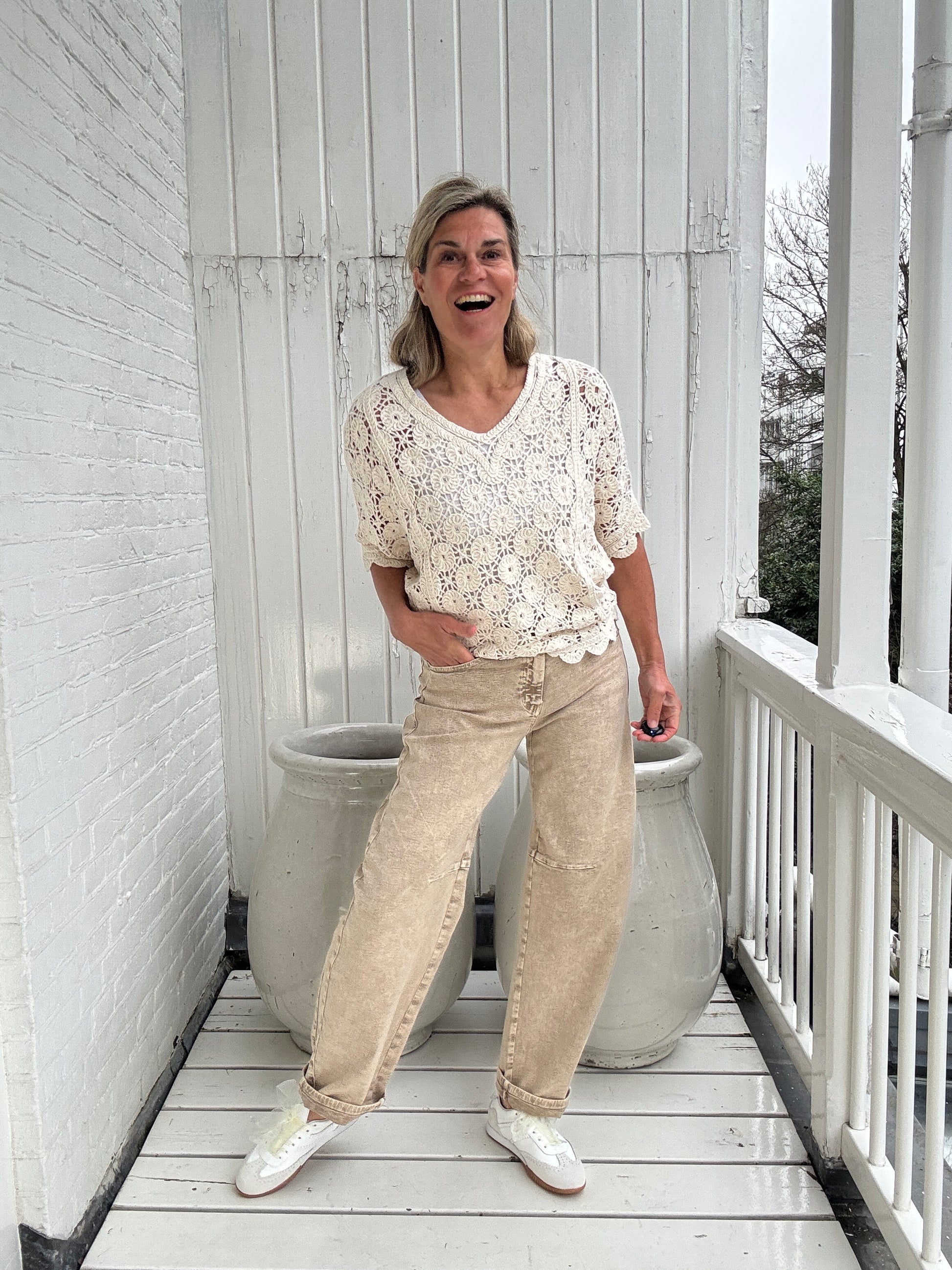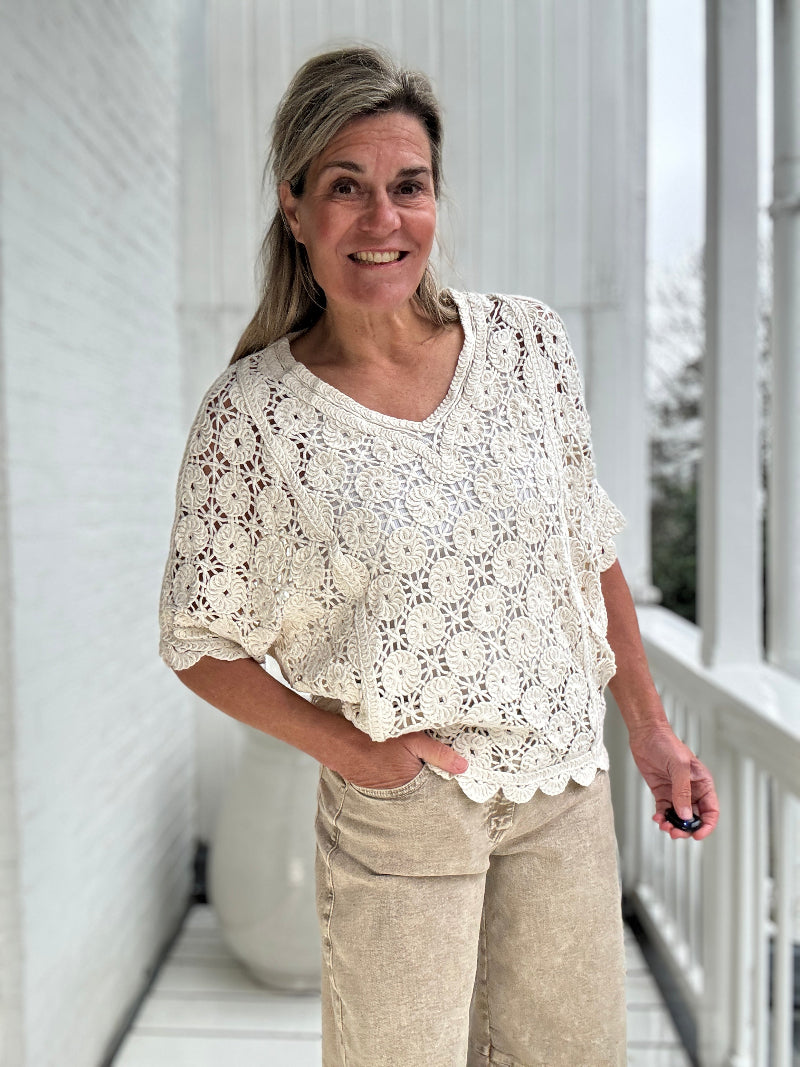 Romantisch is een understatement voor deze trui met prachtig opengewerkt bloemenpatroon, v-hals en raglanmouw.