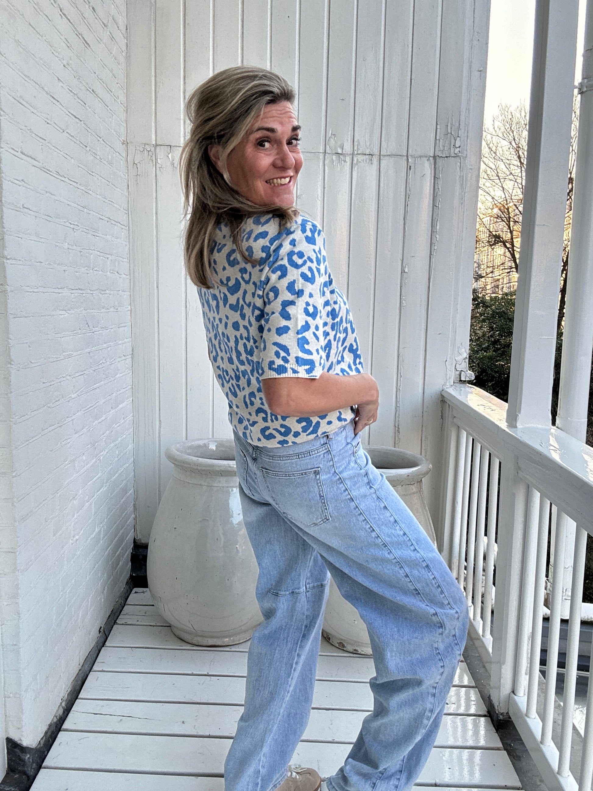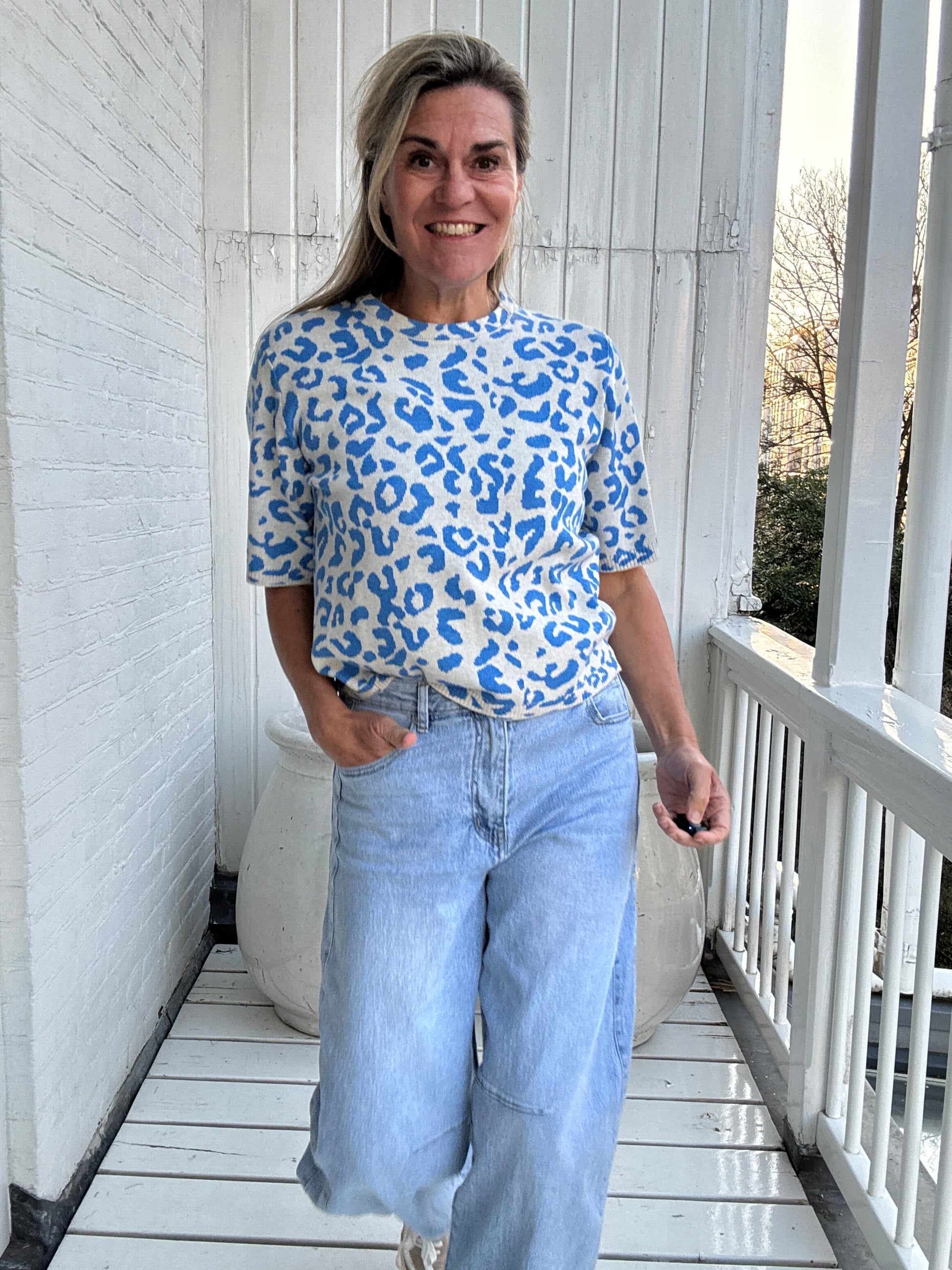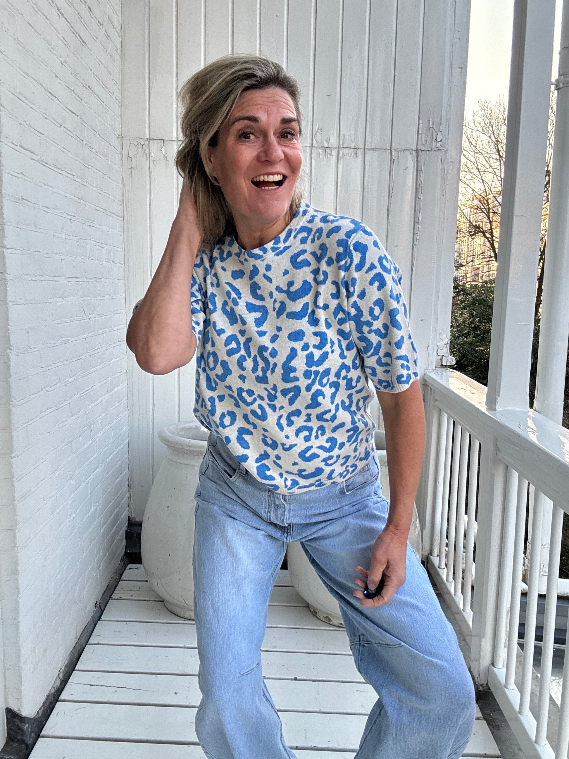 Dit geweldige truitje met korte mouw heeft een geweldige pinterprint en is super onder een blazer of gewoon lekker als trui.