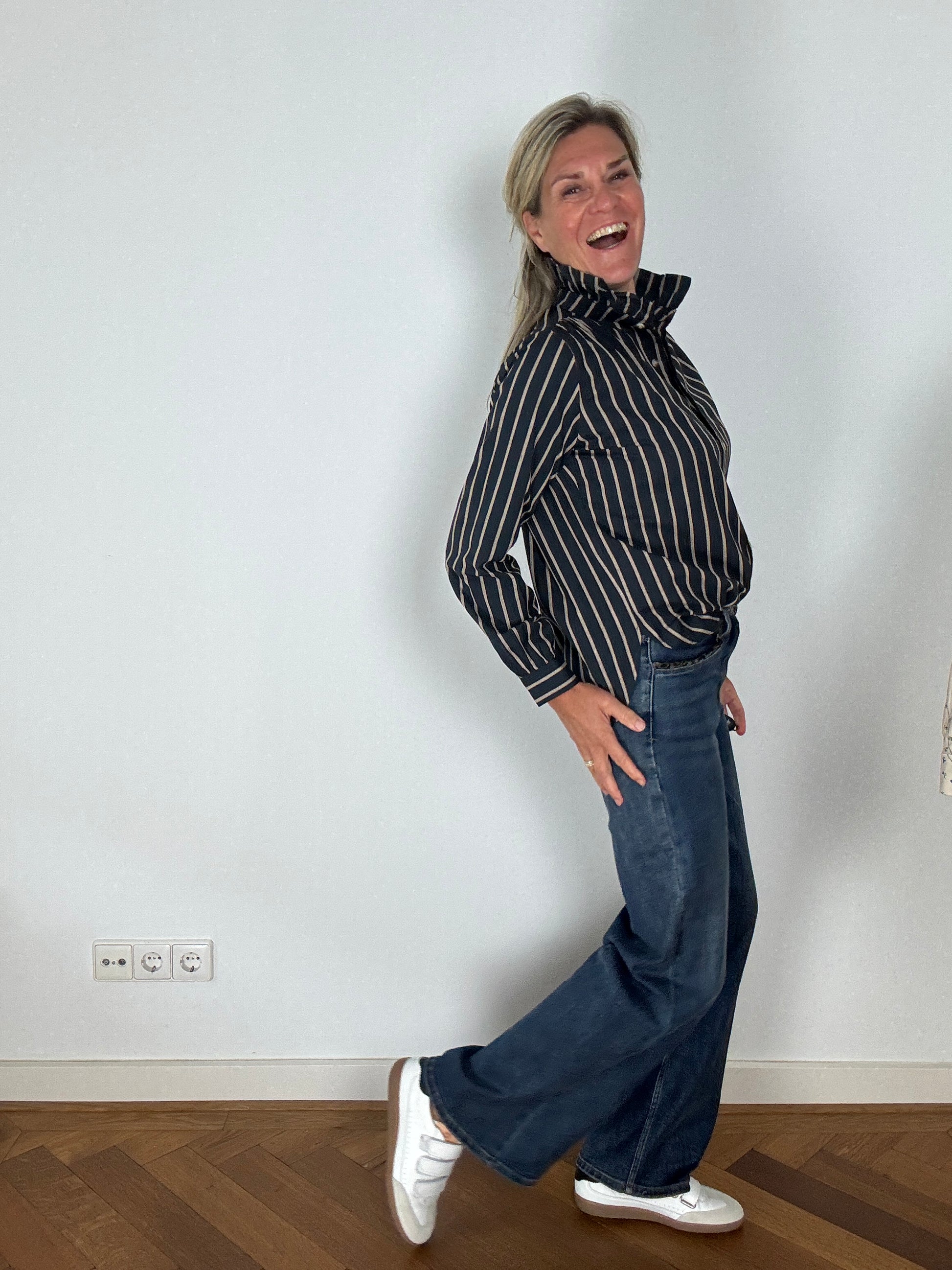 Dit speelse blousje met hoge kraag en de geplooide schouders geven het die moderne twist waar je look net dat beetje extra van krijgt.