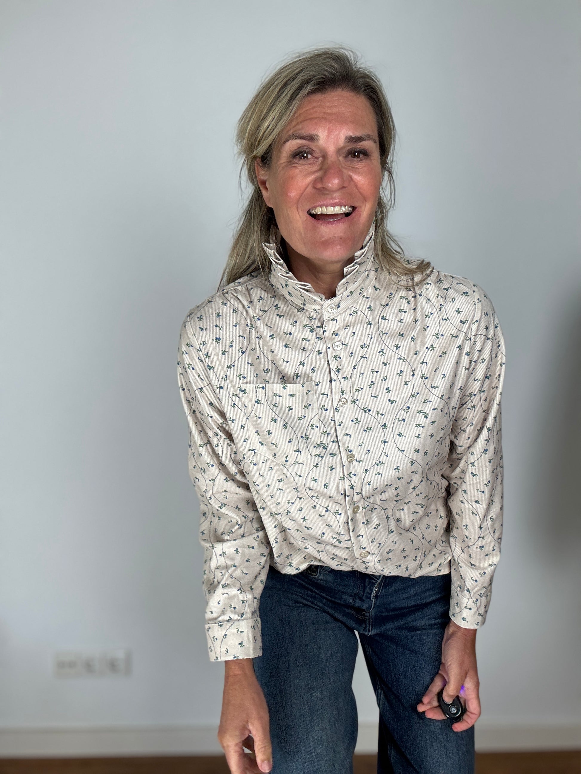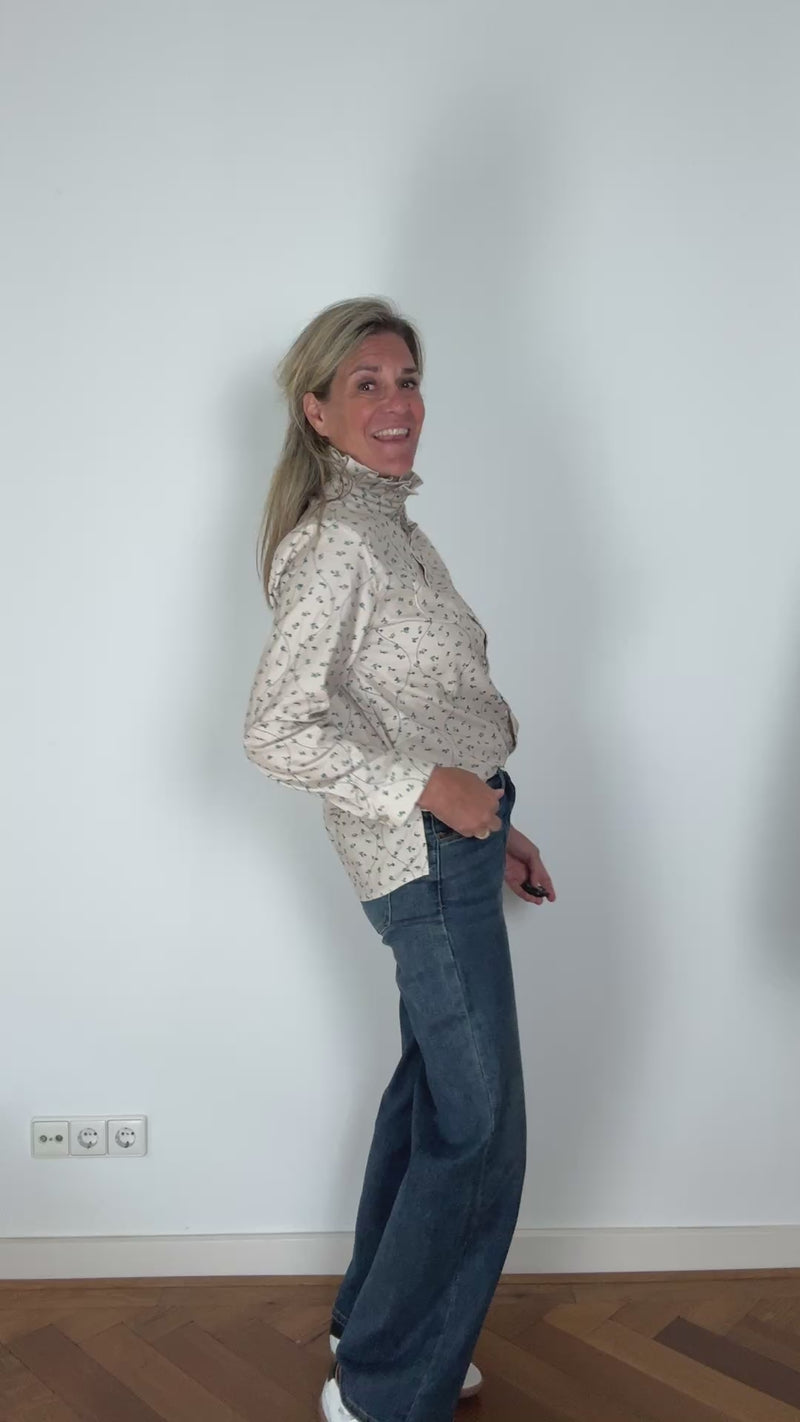 De blouse Sharon combineert romantiek met een modern detail. De lichte beige stof heeft een subtiel ribbeltje en is versierd met kleine groene bloemetjes. De hoge kraag en de zachte plooitjes bij de schouders maken haar helemaal Cartouche: vrouwelijk, speels en toch elegant.