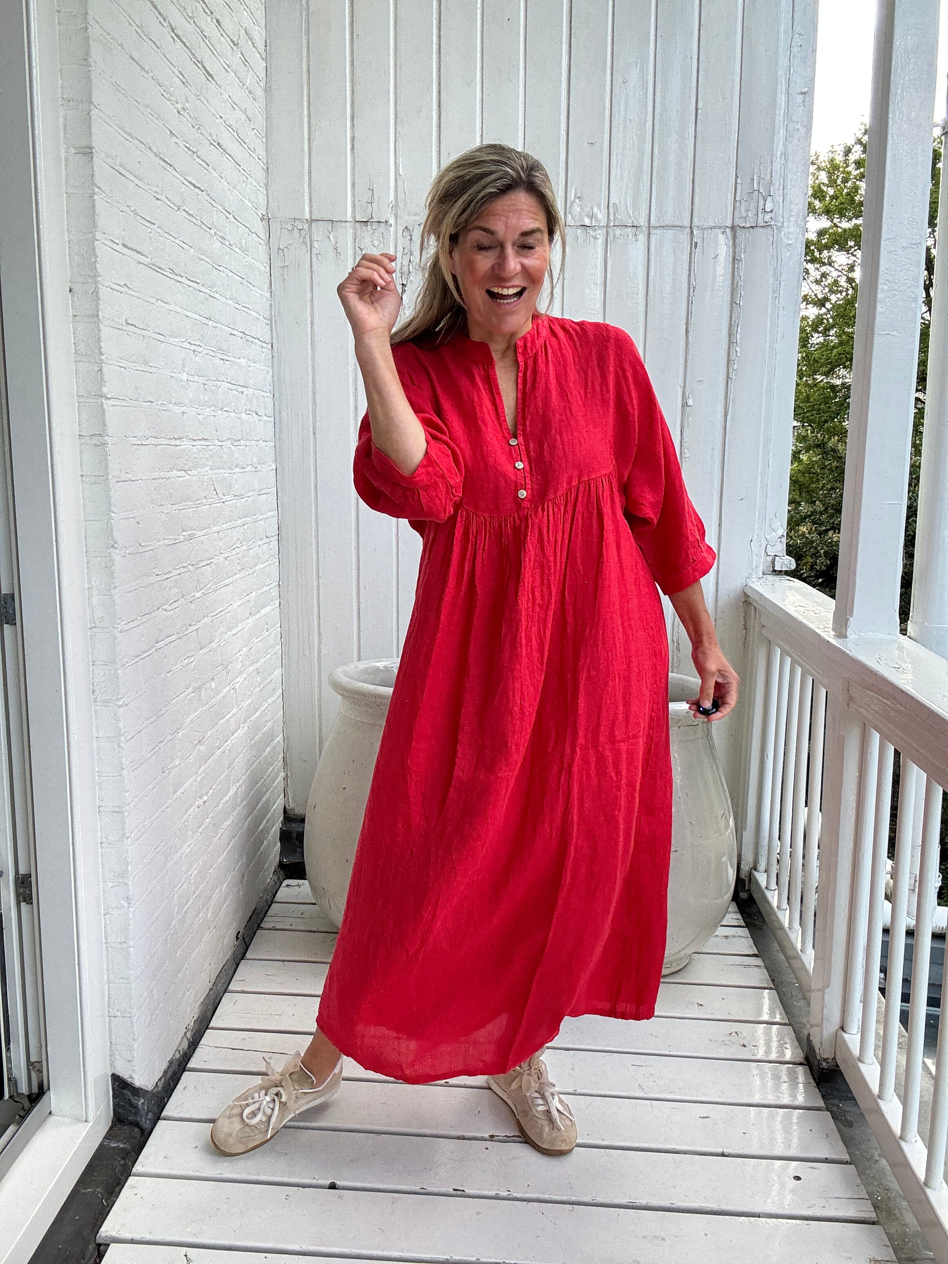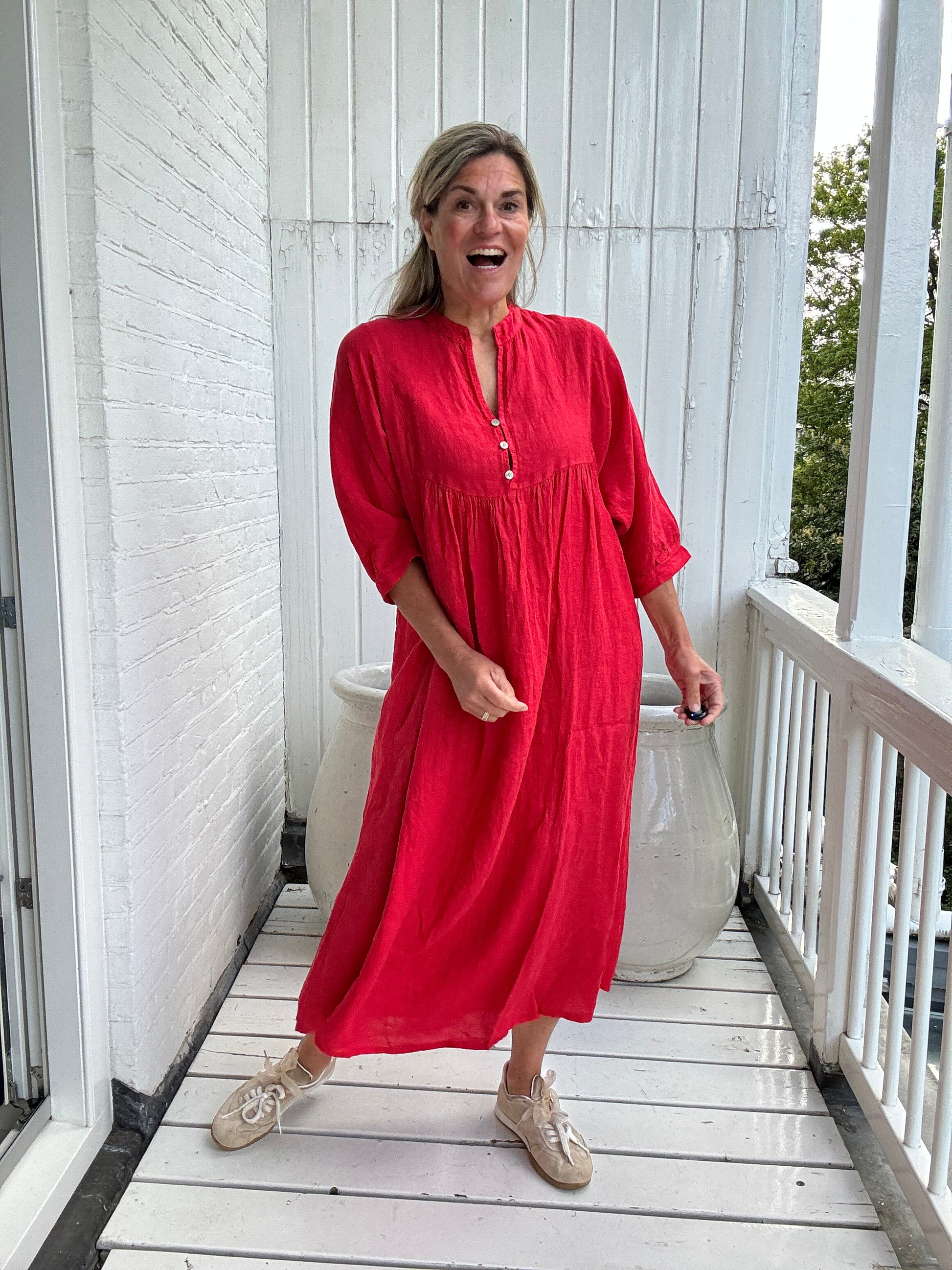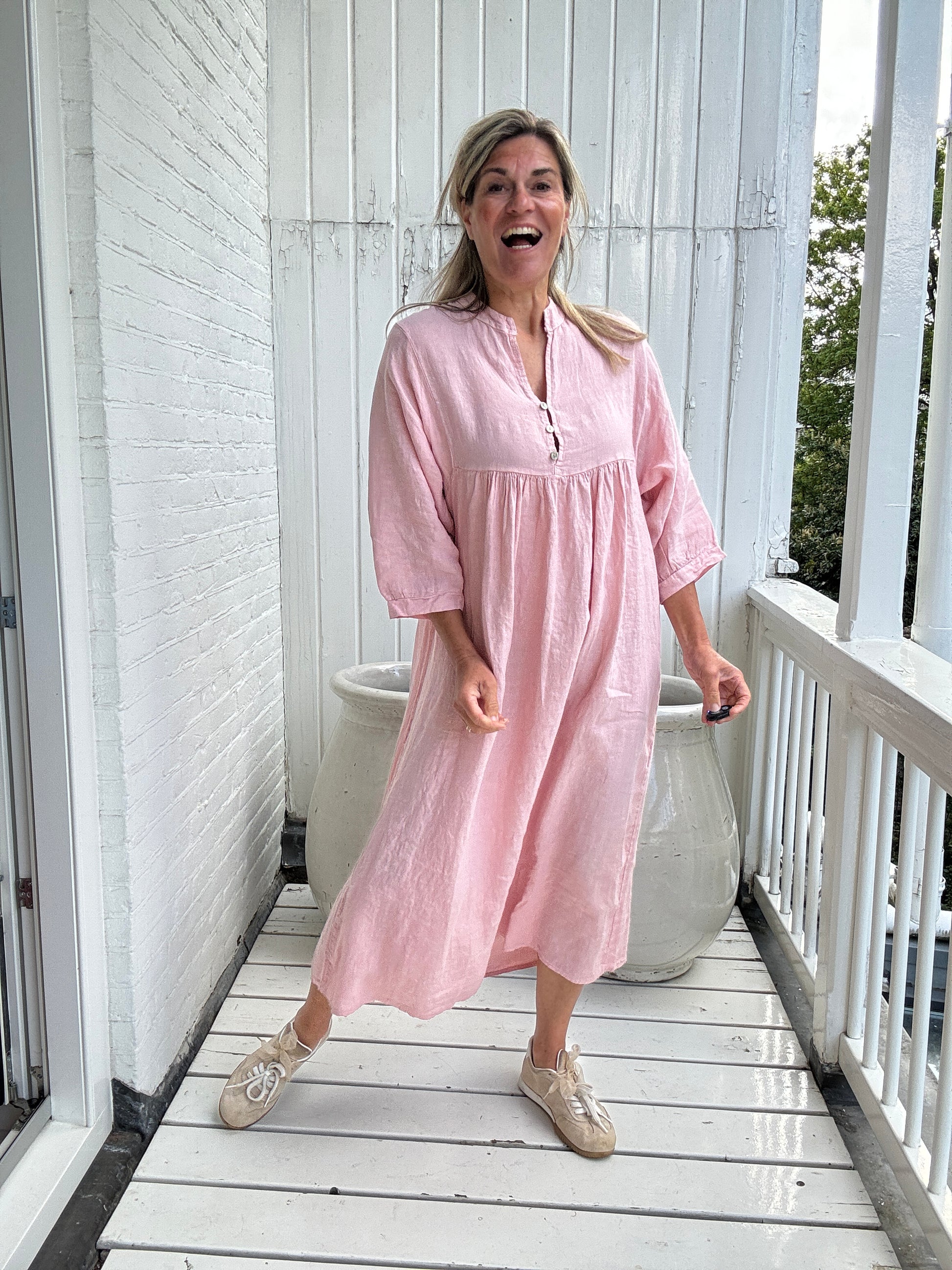 Trek deze jurk aan en je trekt hem nooit meer uit! Met de mooie v-hals, 3/4e mouw, knoopdetail, subtiele plooien onder de borst en het zachte linnen kan je stijlvol voor de dag komen!