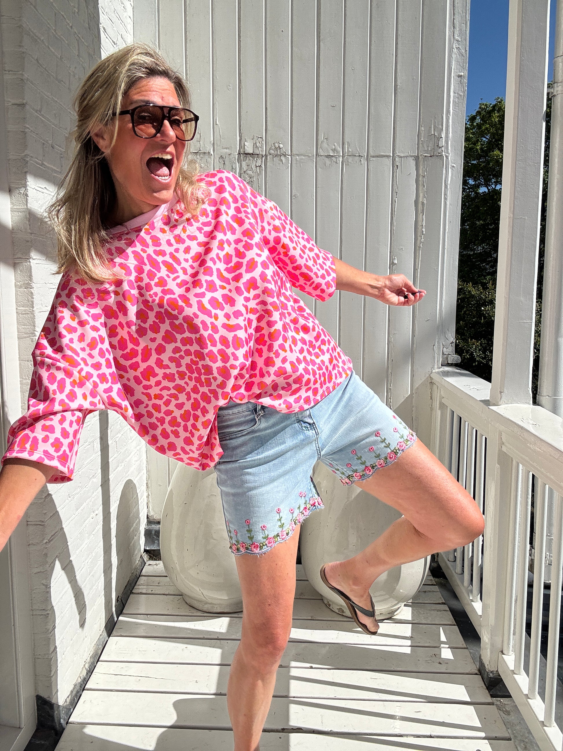 Hoe leuk is deze spijker short met geborduurde bloemen en een schulprand. De short heeft een hoge taille.