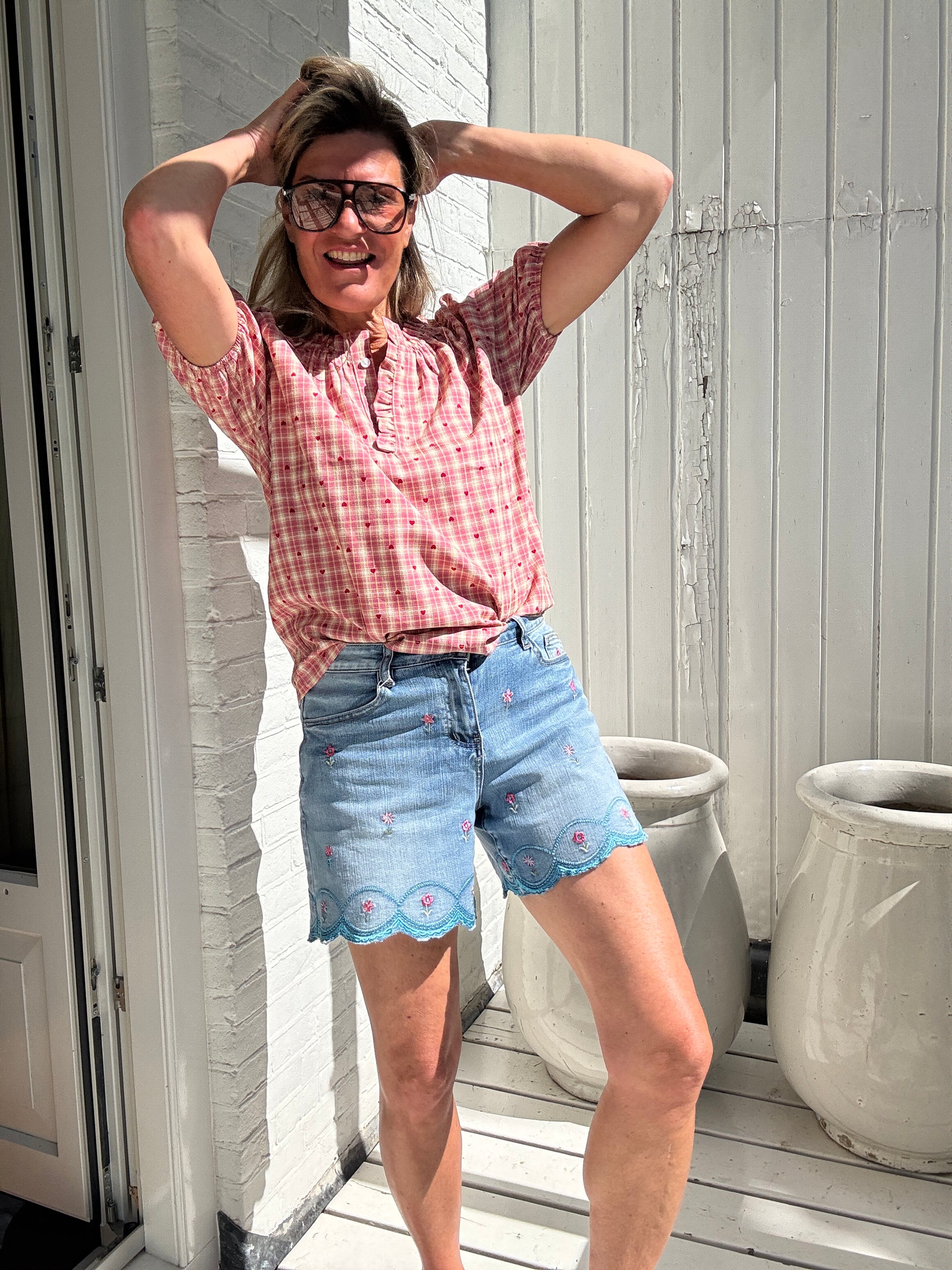 Een vrolijk zomerse short met geborduurde bloemetjes en een schulprand aan de onderkant.