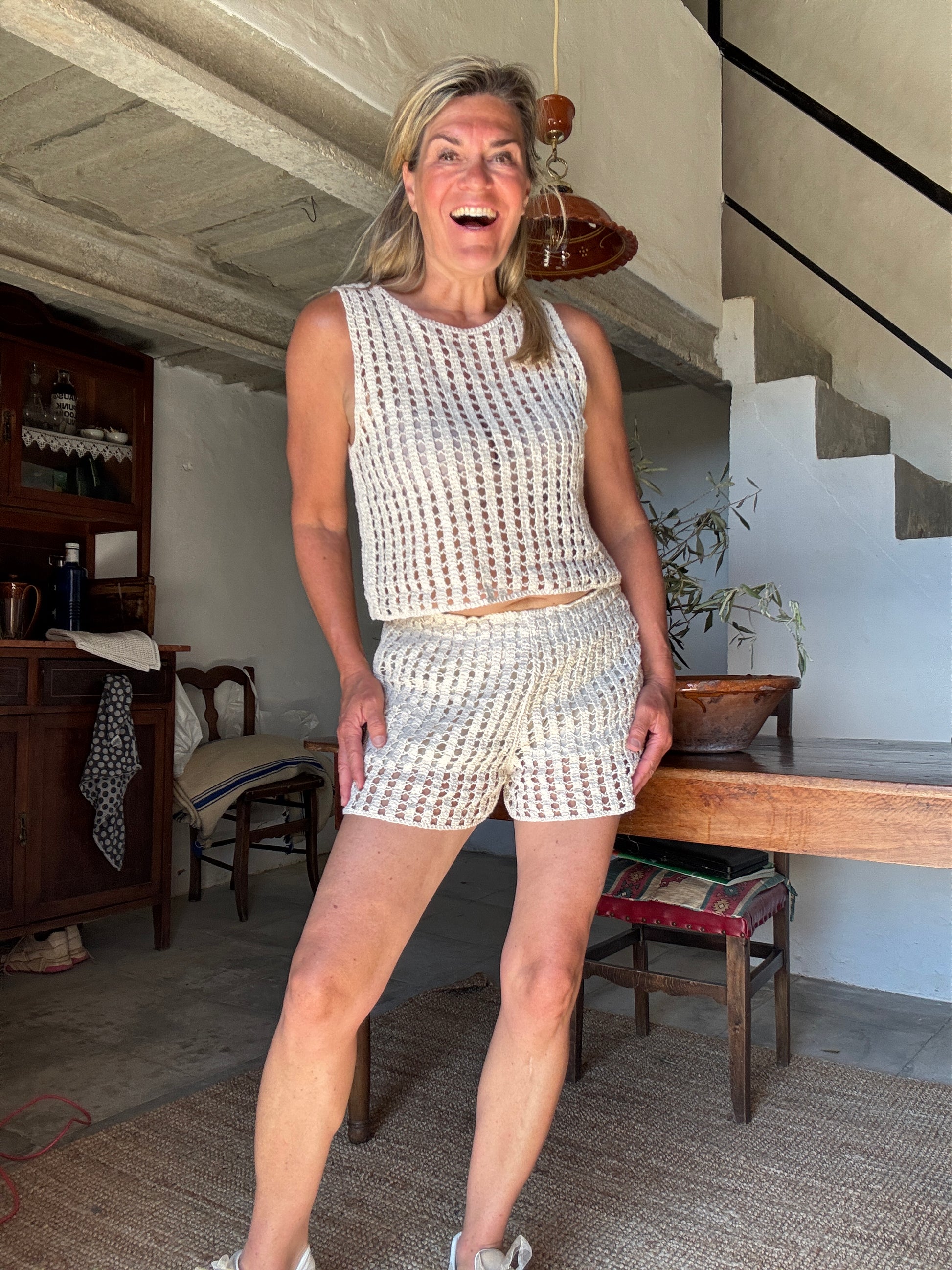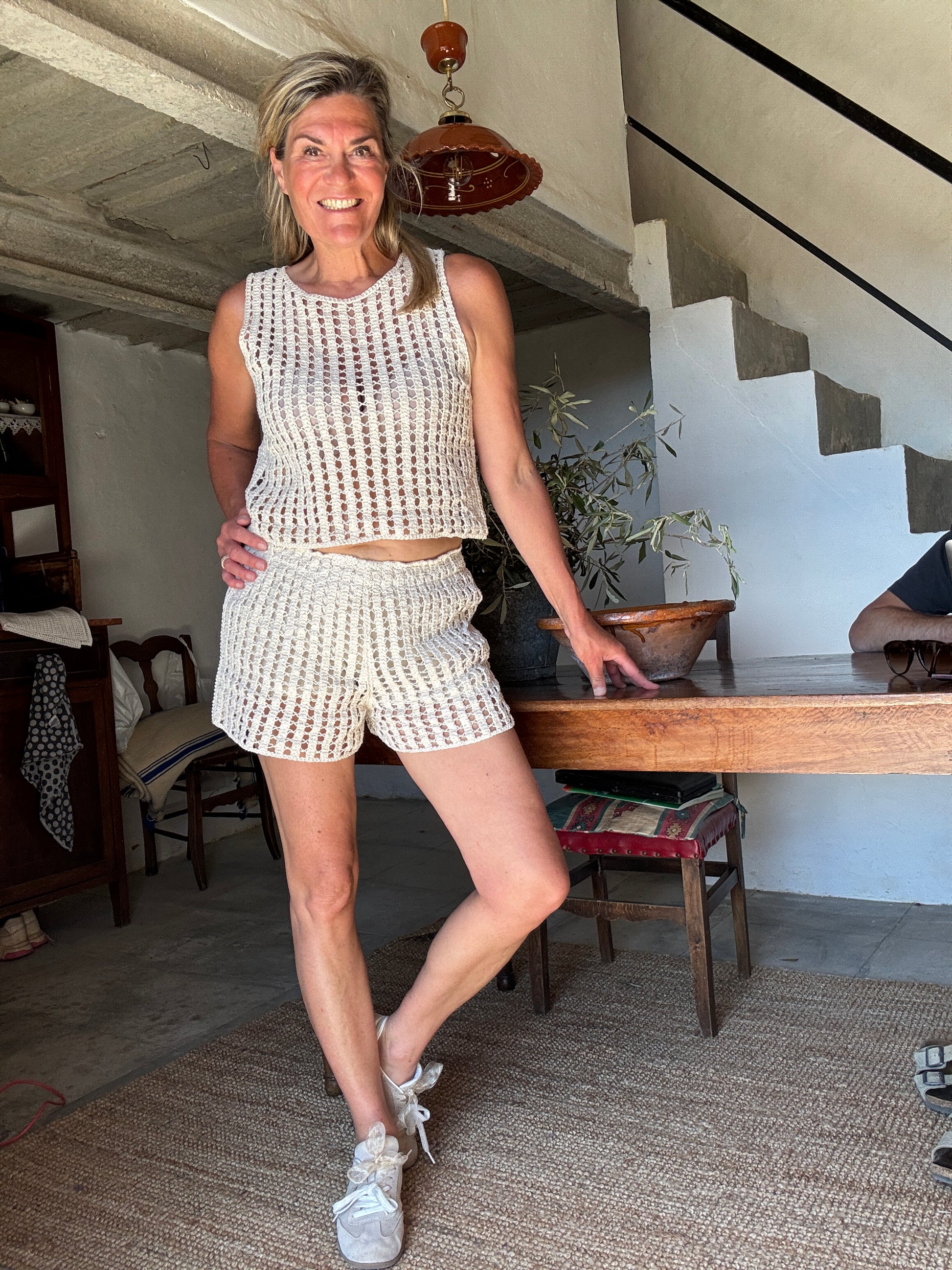 Zomers en luchtig is deze tanktop van opengewertk breisel. Combineer de top met het leuke shortje Cindy voor een mooie setje completje.