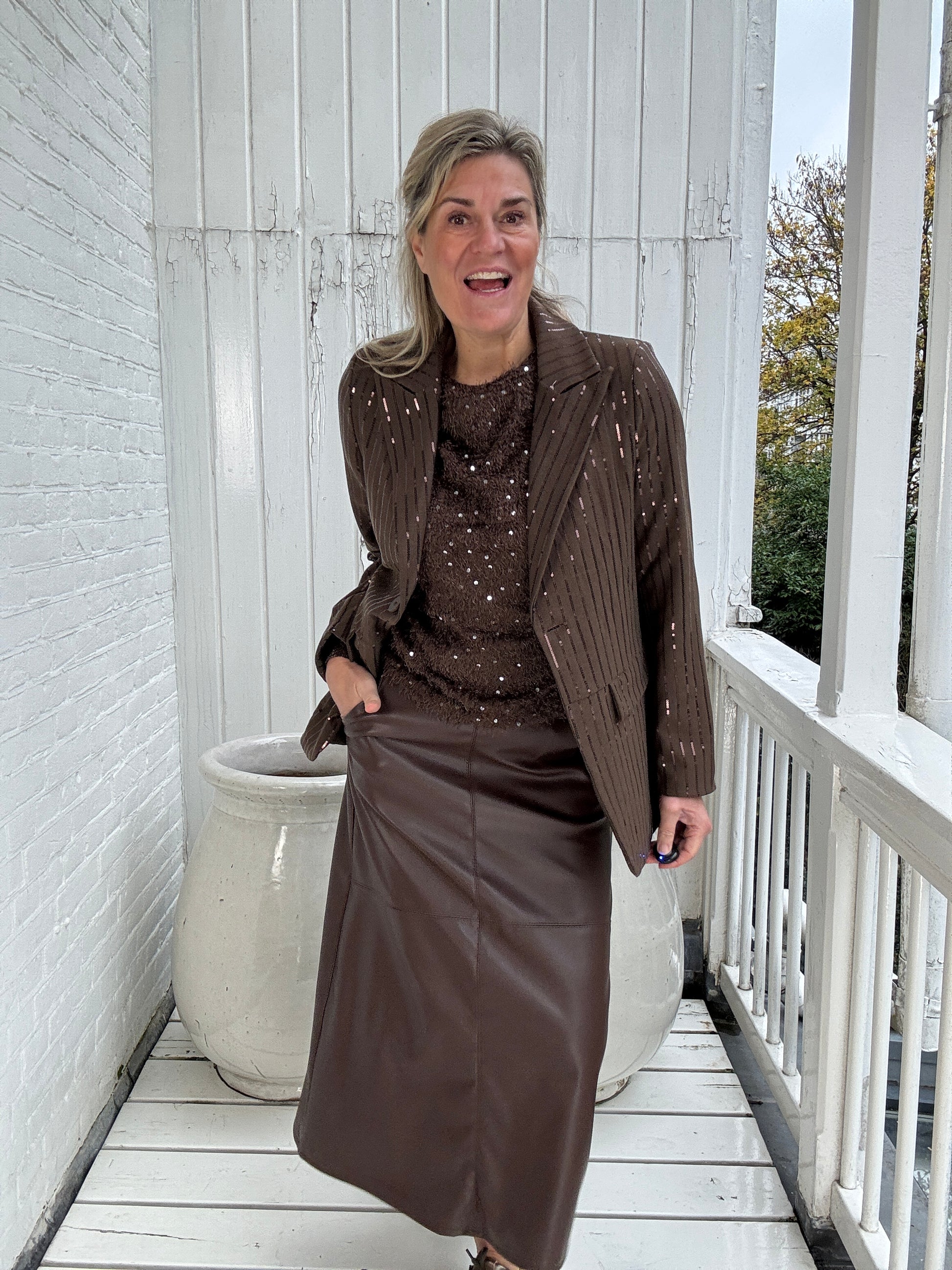 Glitter en glamour in deze mooie blazer met een streep van stijlvolle pailletten.