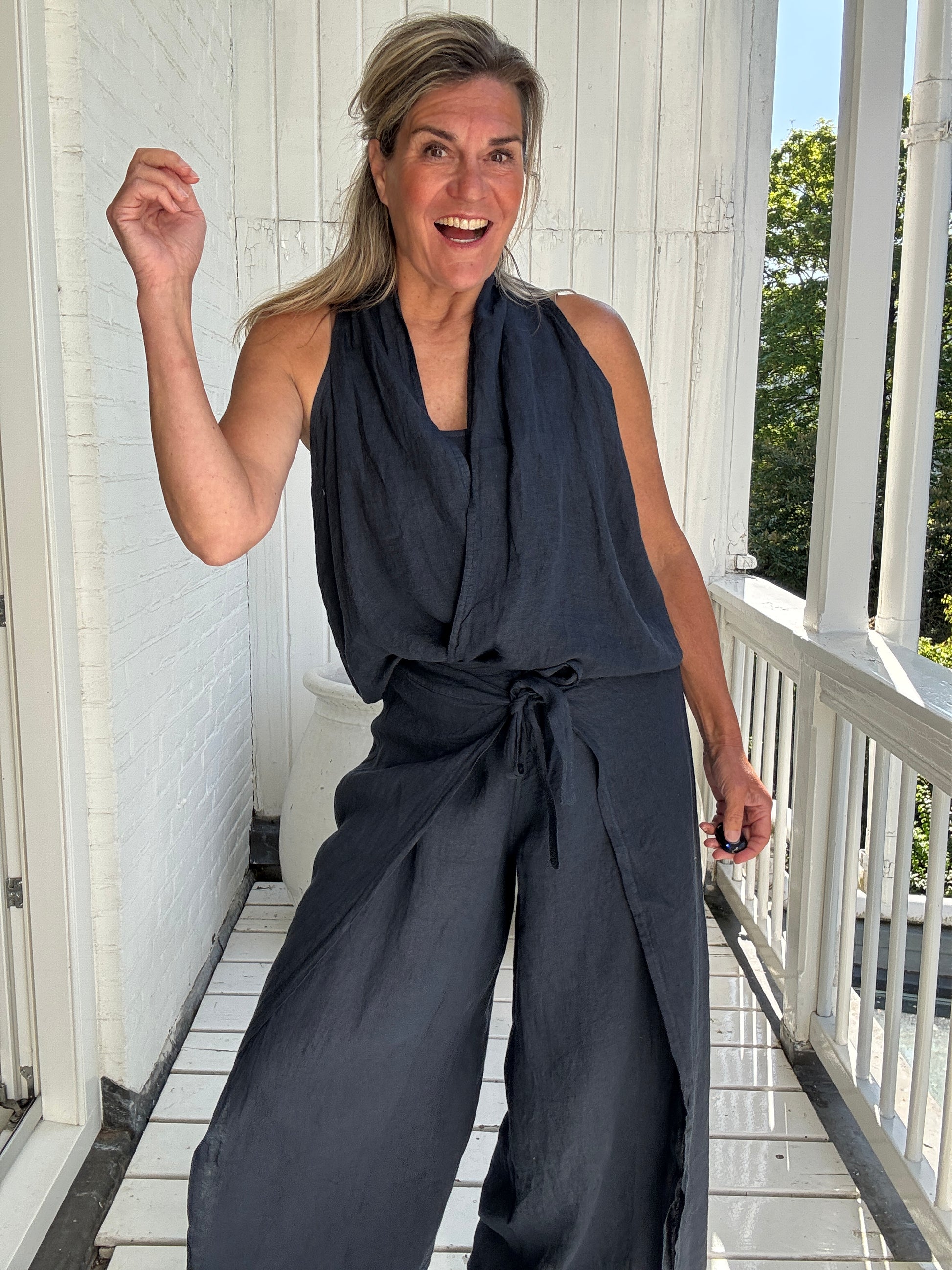 De soepele, linnen stof van deze wijdvallende broek valt prachtig langs het lichaam en de overslag met strikdetail geeft nét dat beetje extra vorm en vrouwelijkheid.
