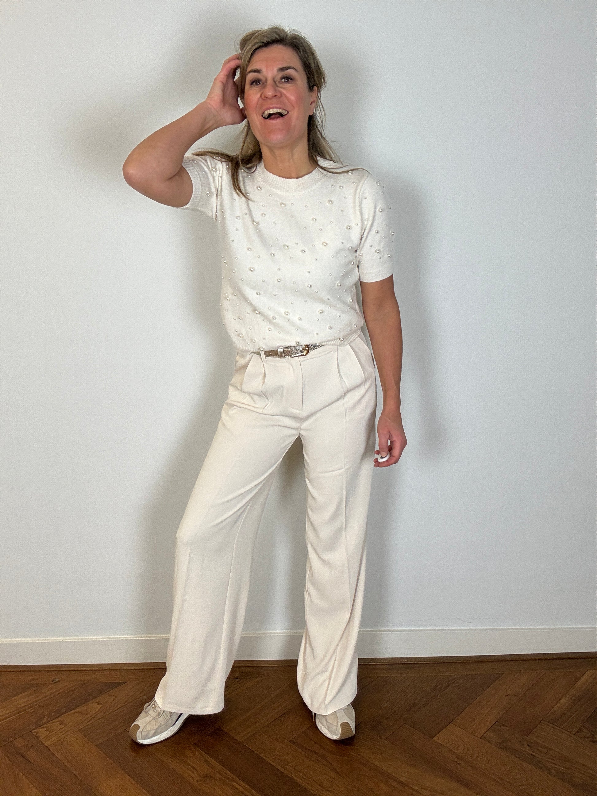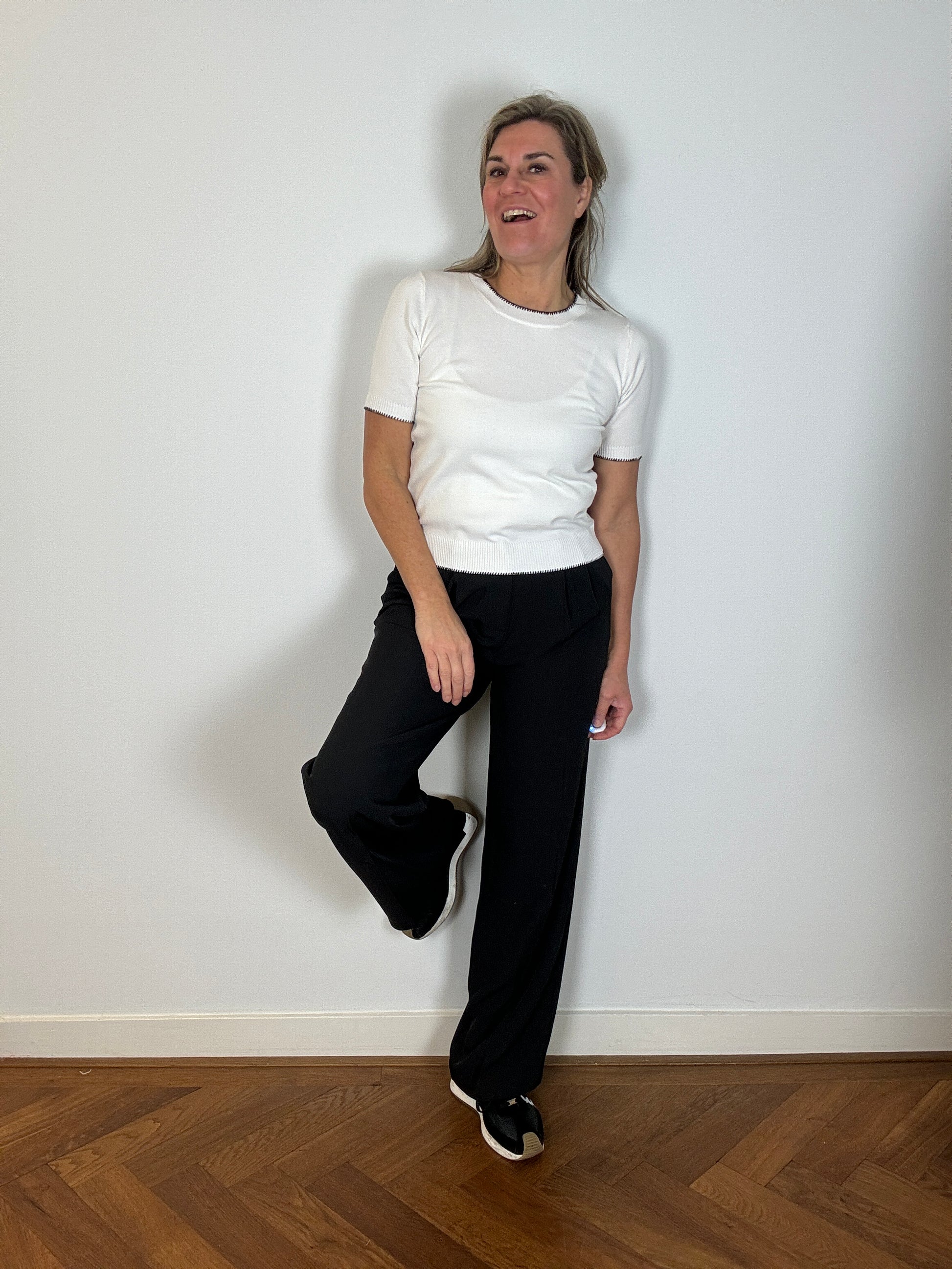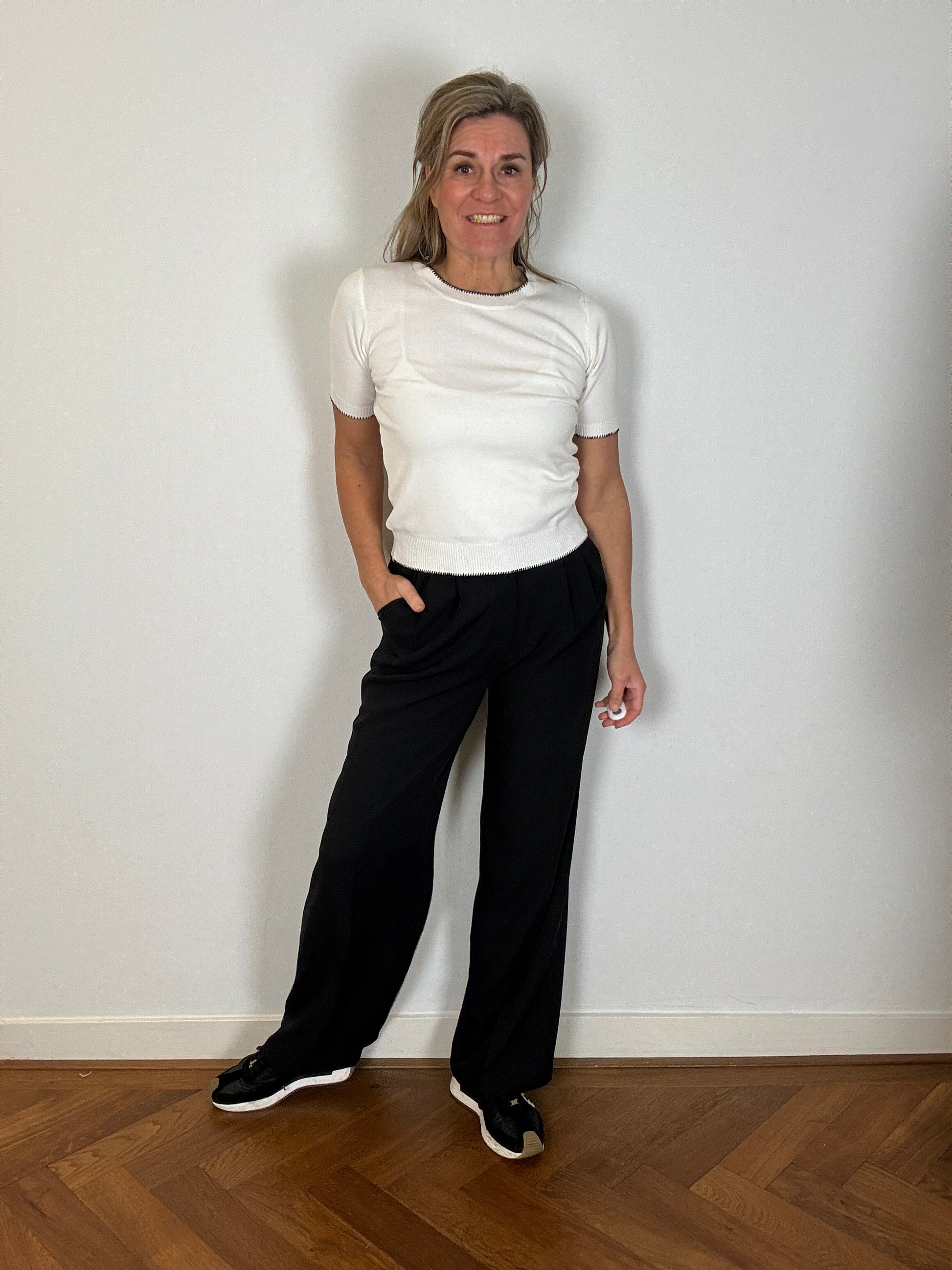 Deze soepelvallende broek heeft een rechte pijp. Er zitten zakken in en aan de achterkant heeft de broek paspolzakken. Er zijn ook lusjes voor een riem.