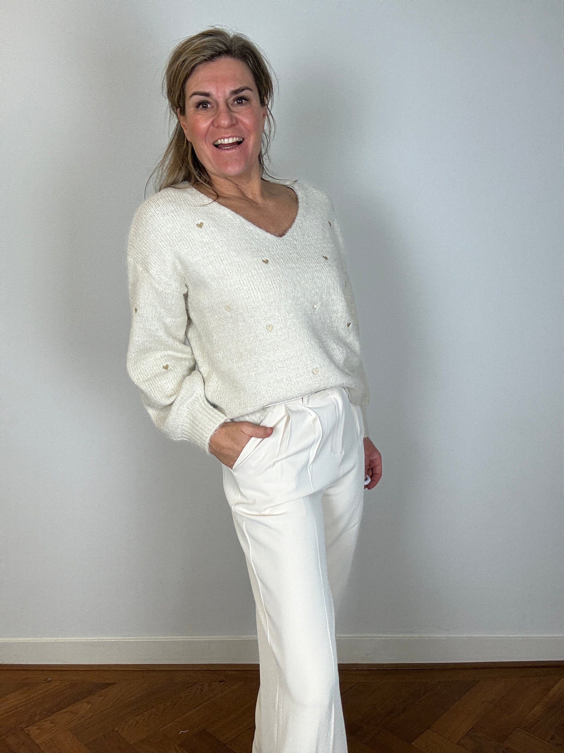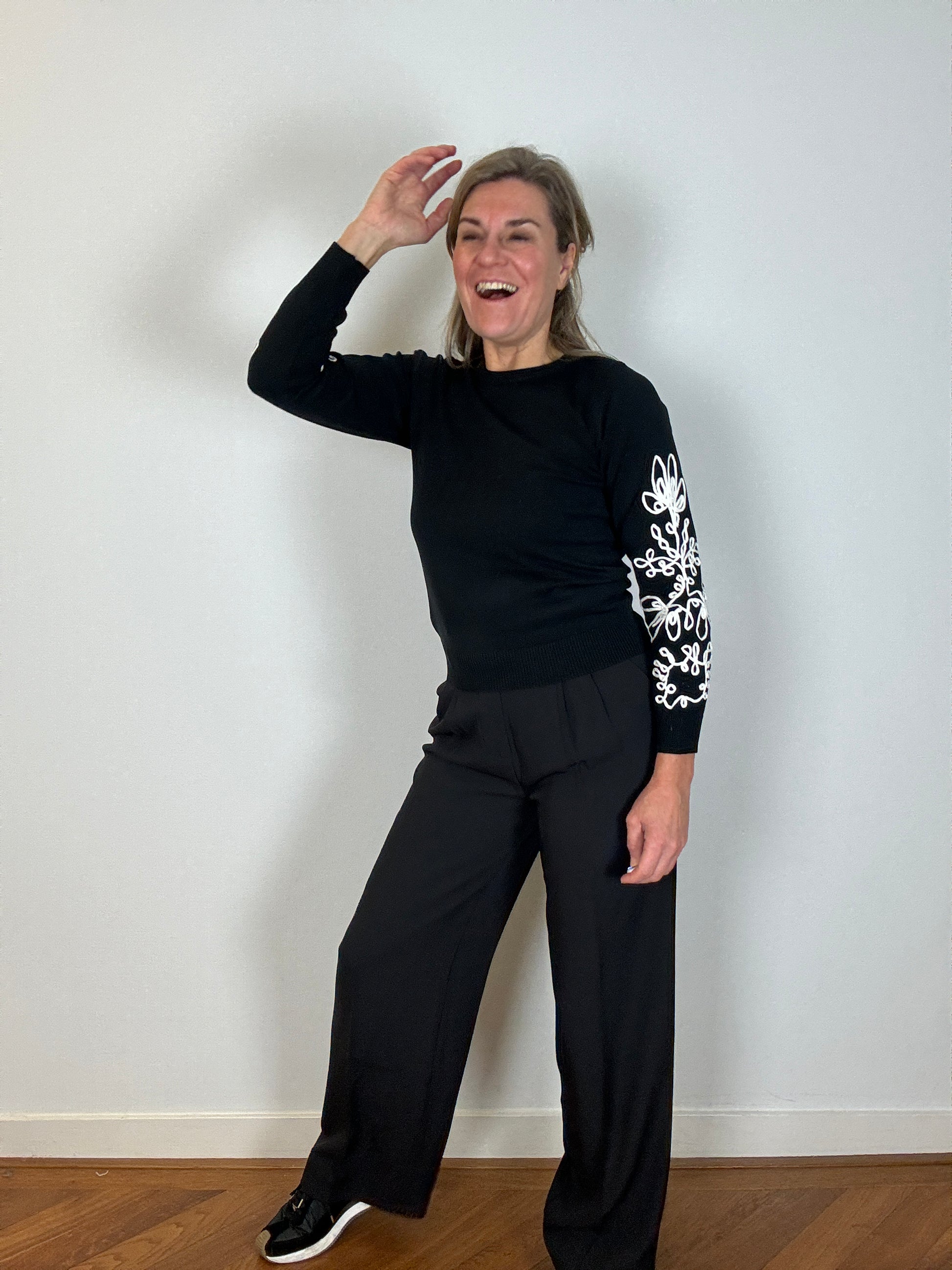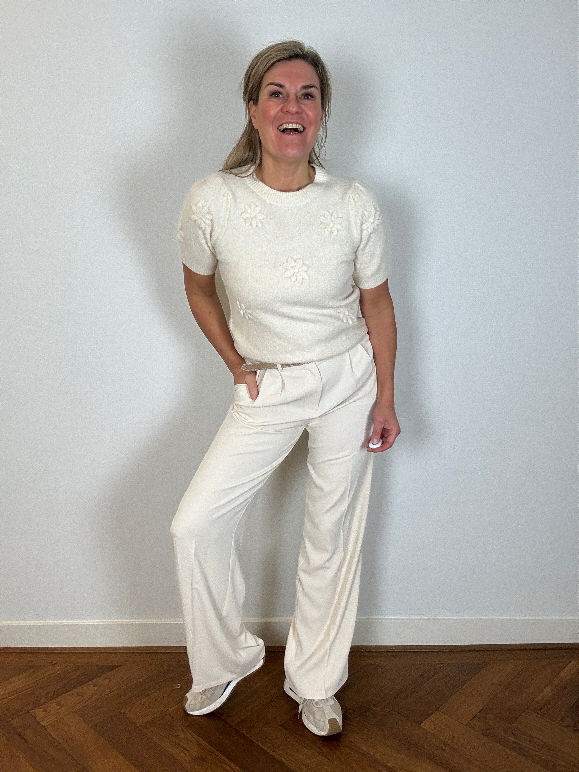 Deze soepelvallende broek heeft een rechte pijp. Er zitten zakken in en aan de achterkant heeft de broek paspolzakken. Er zijn ook lusjes voor een riem.