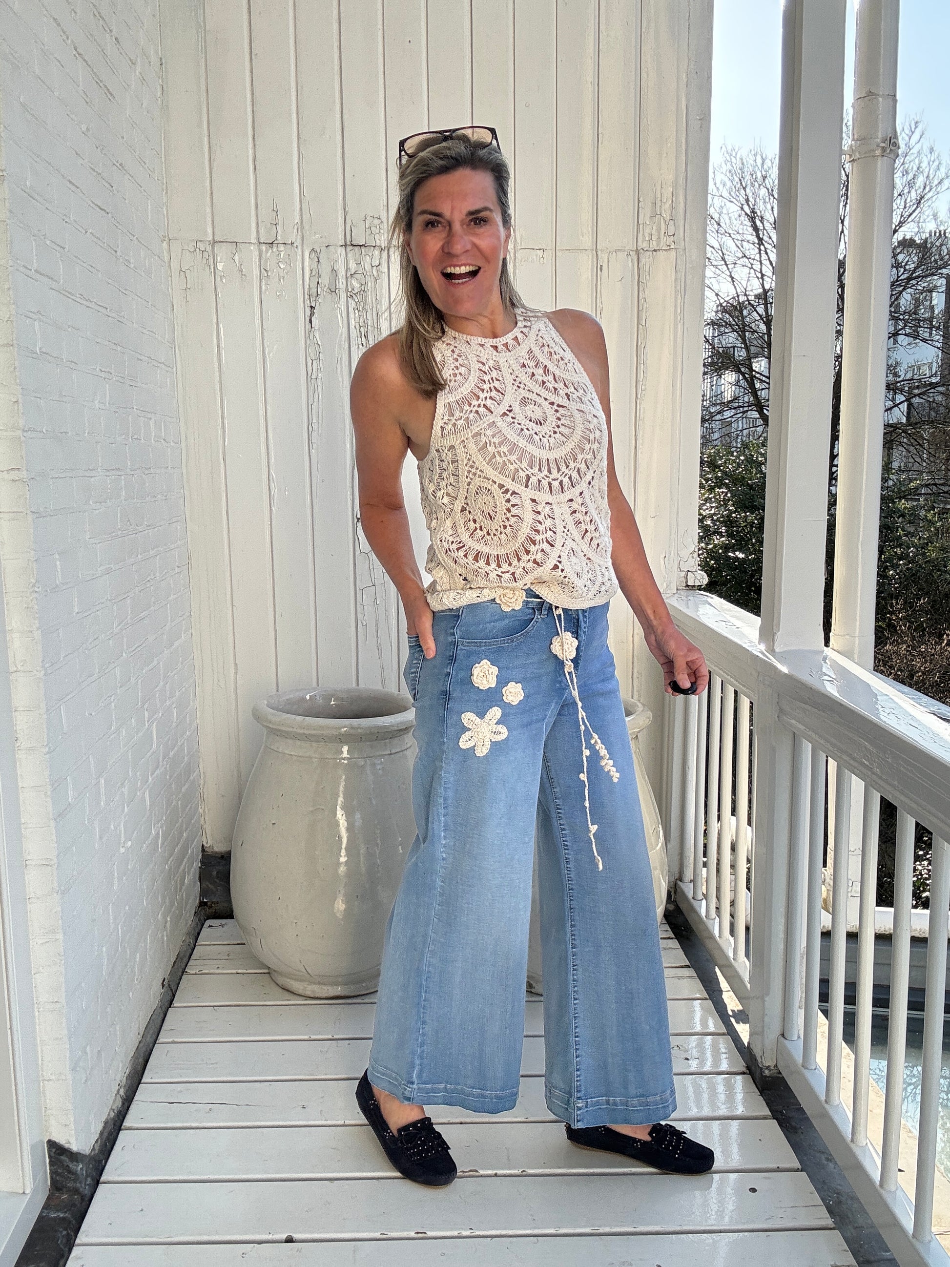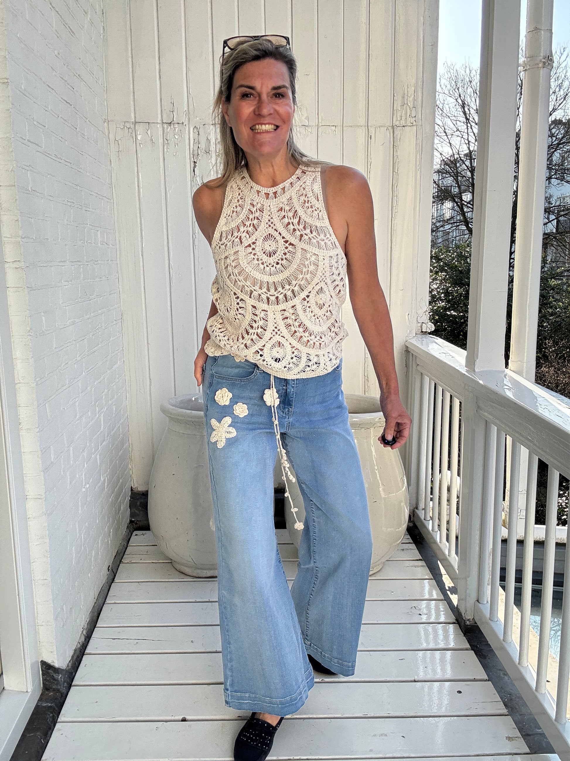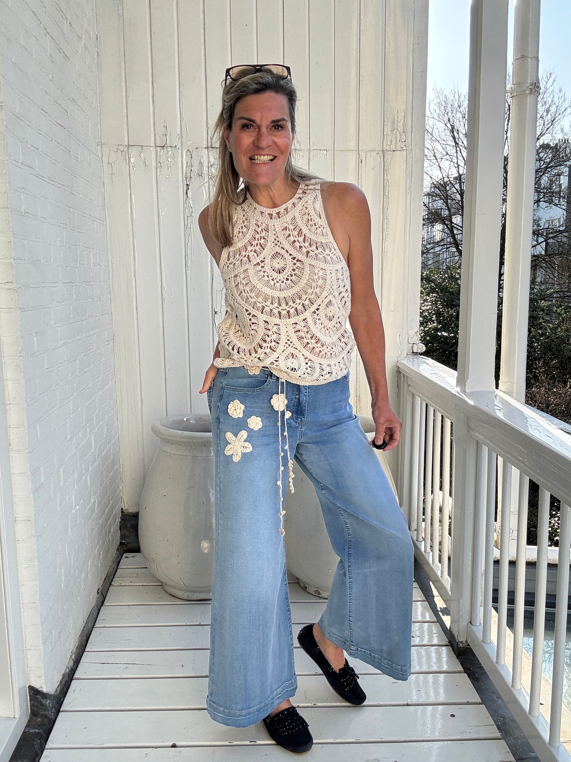 Bohemian vibes heeft deze mooie wijde jeans met subtiele bloemen borduursels.