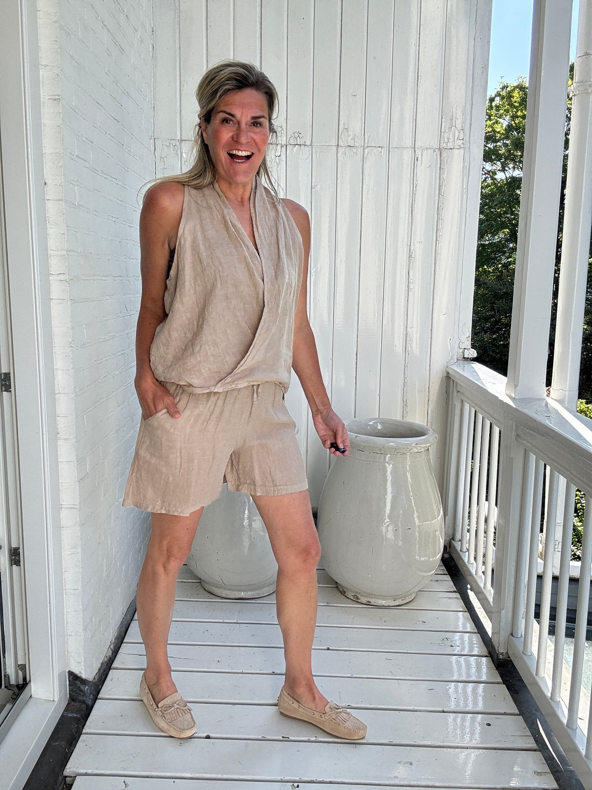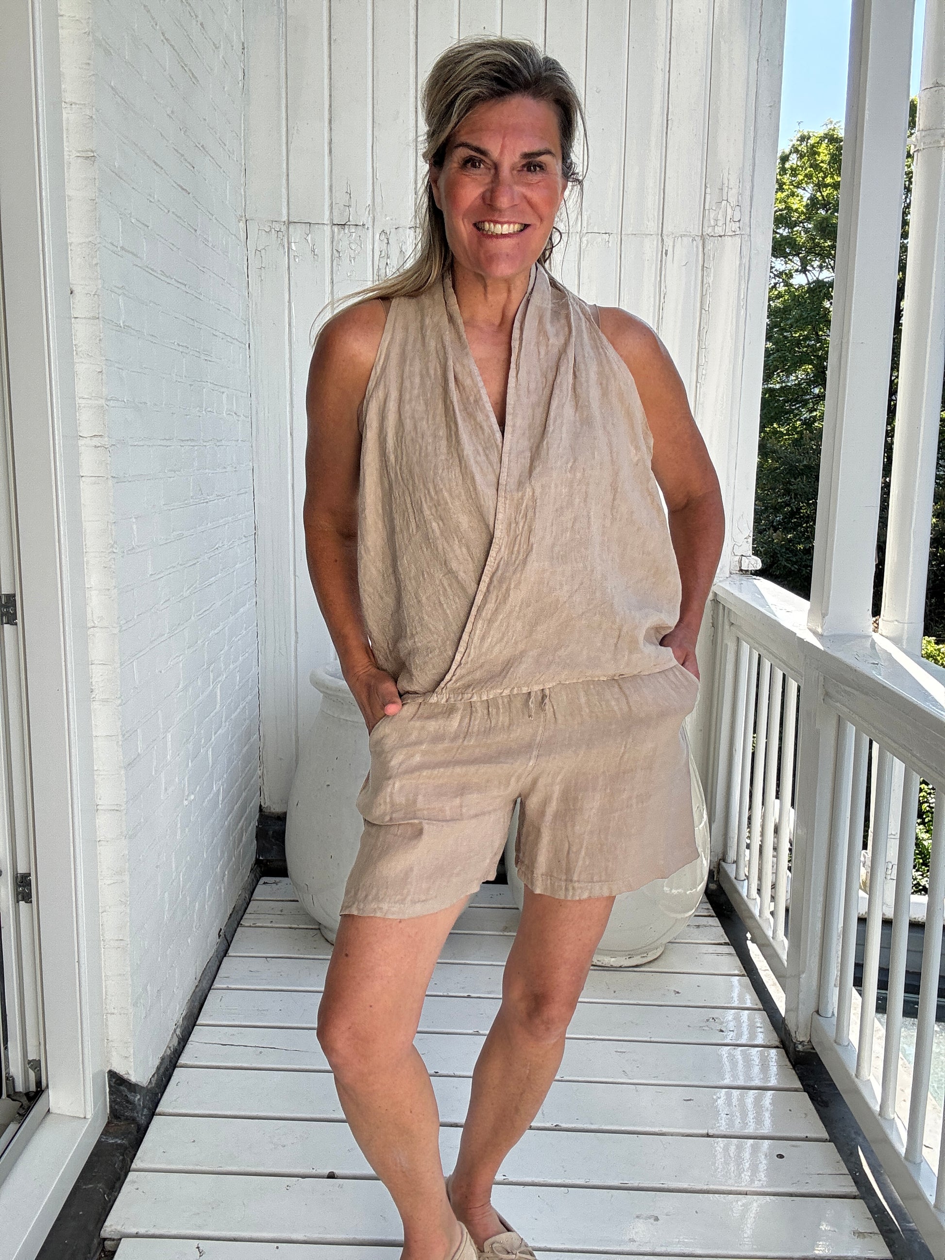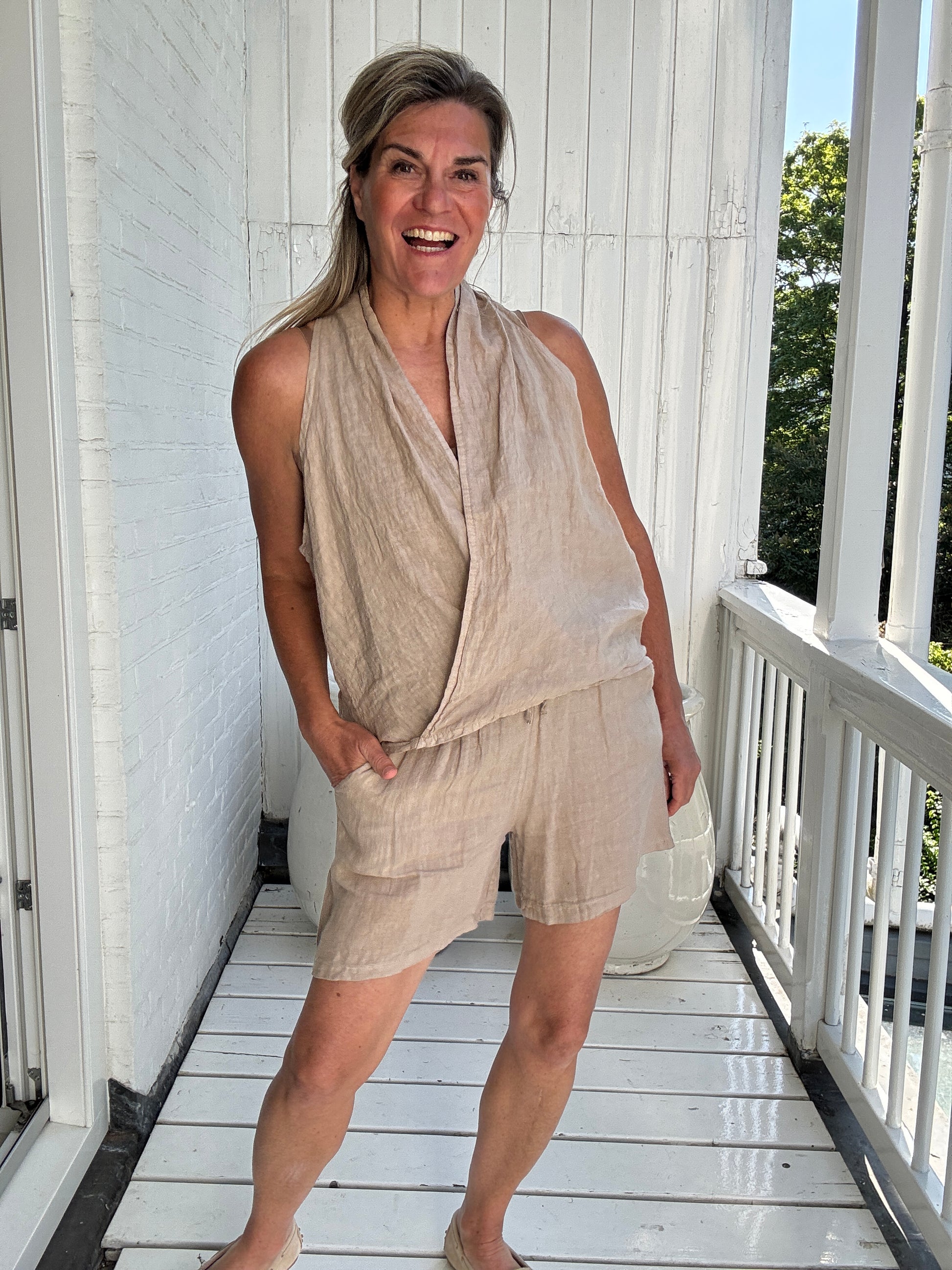 Dit korte, linnen broekje heeft elastiek in de bovenkant, zijzakken en een touwtje om aan te snoeren. Perfect om met een leuke linnen blouse te combineren!