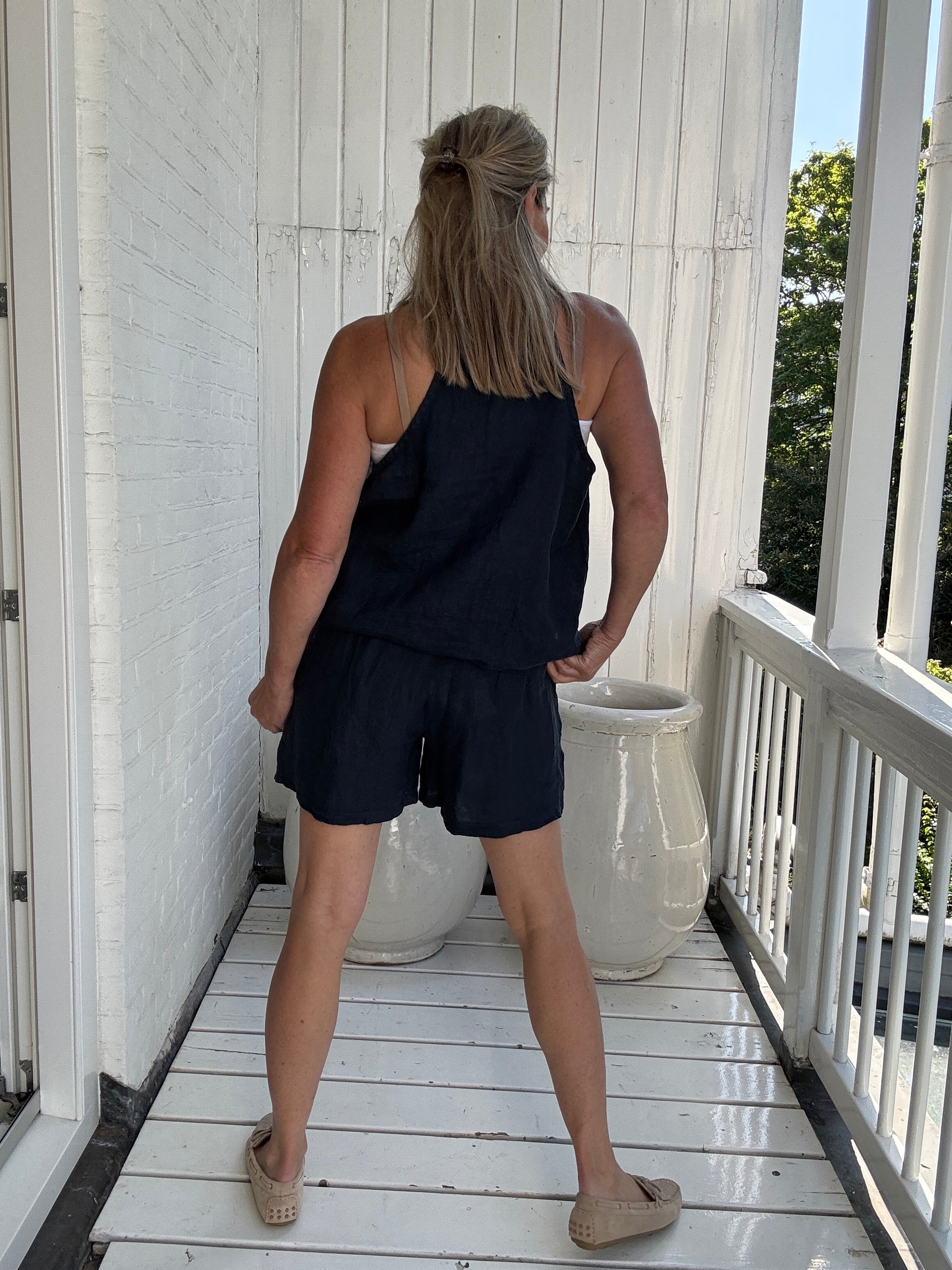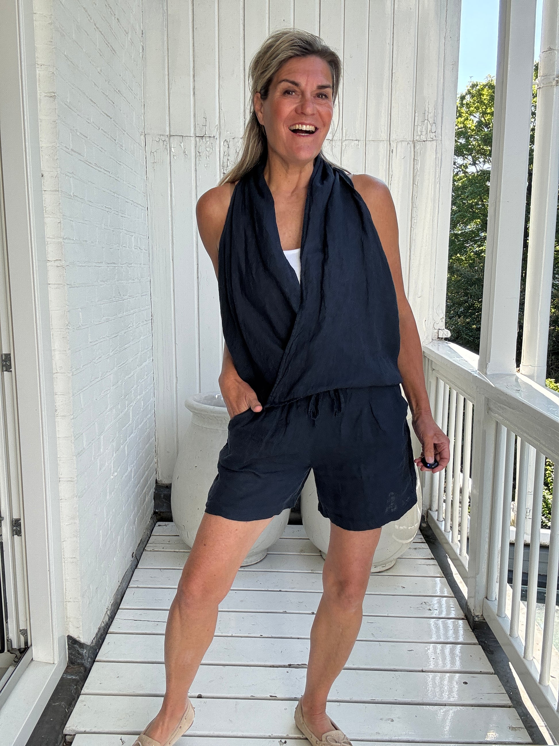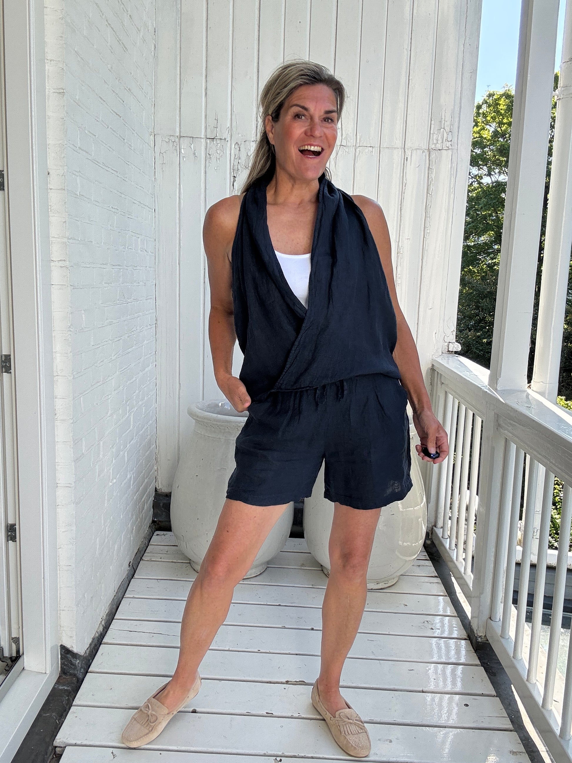 Dit korte, linnen broekje heeft elastiek in de bovenkant, zijzakken en een touwtje om aan te snoeren. Perfect om met een leuke linnen blouse te combineren!
