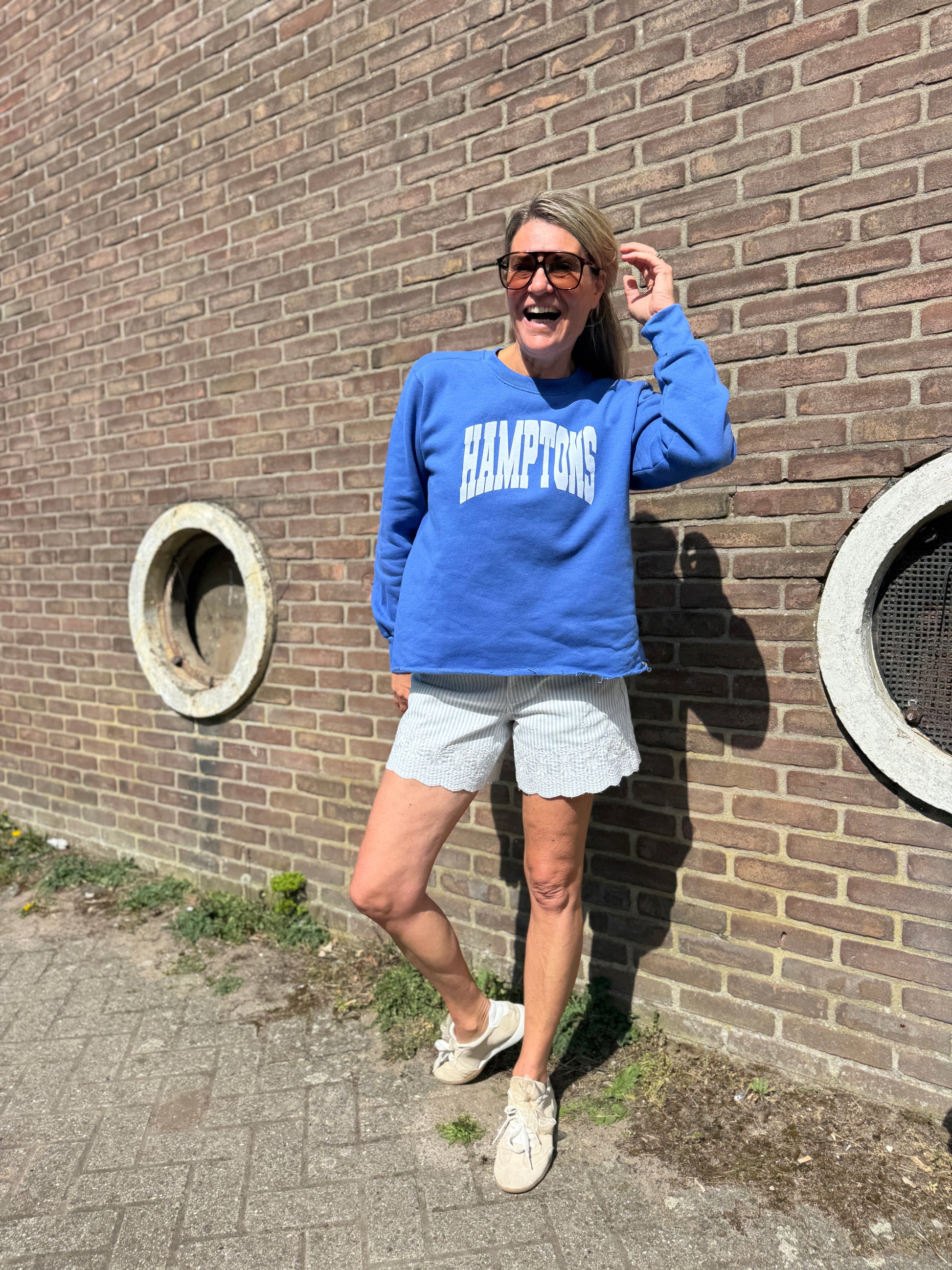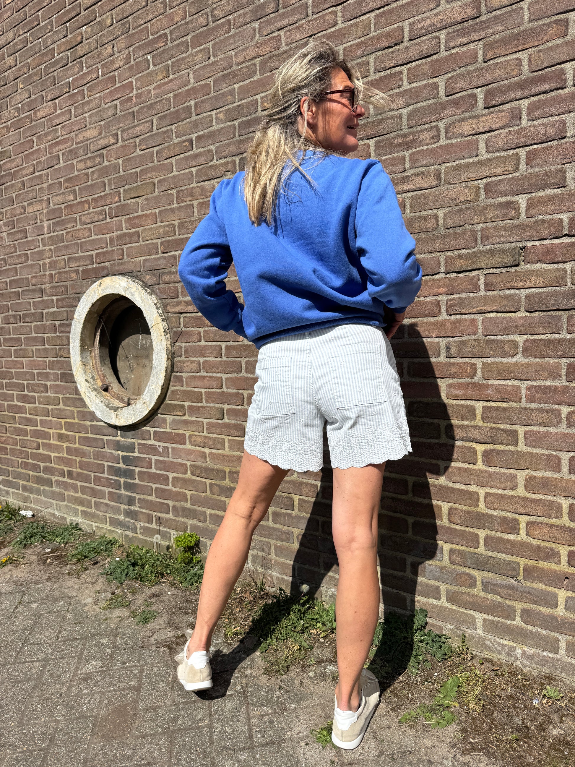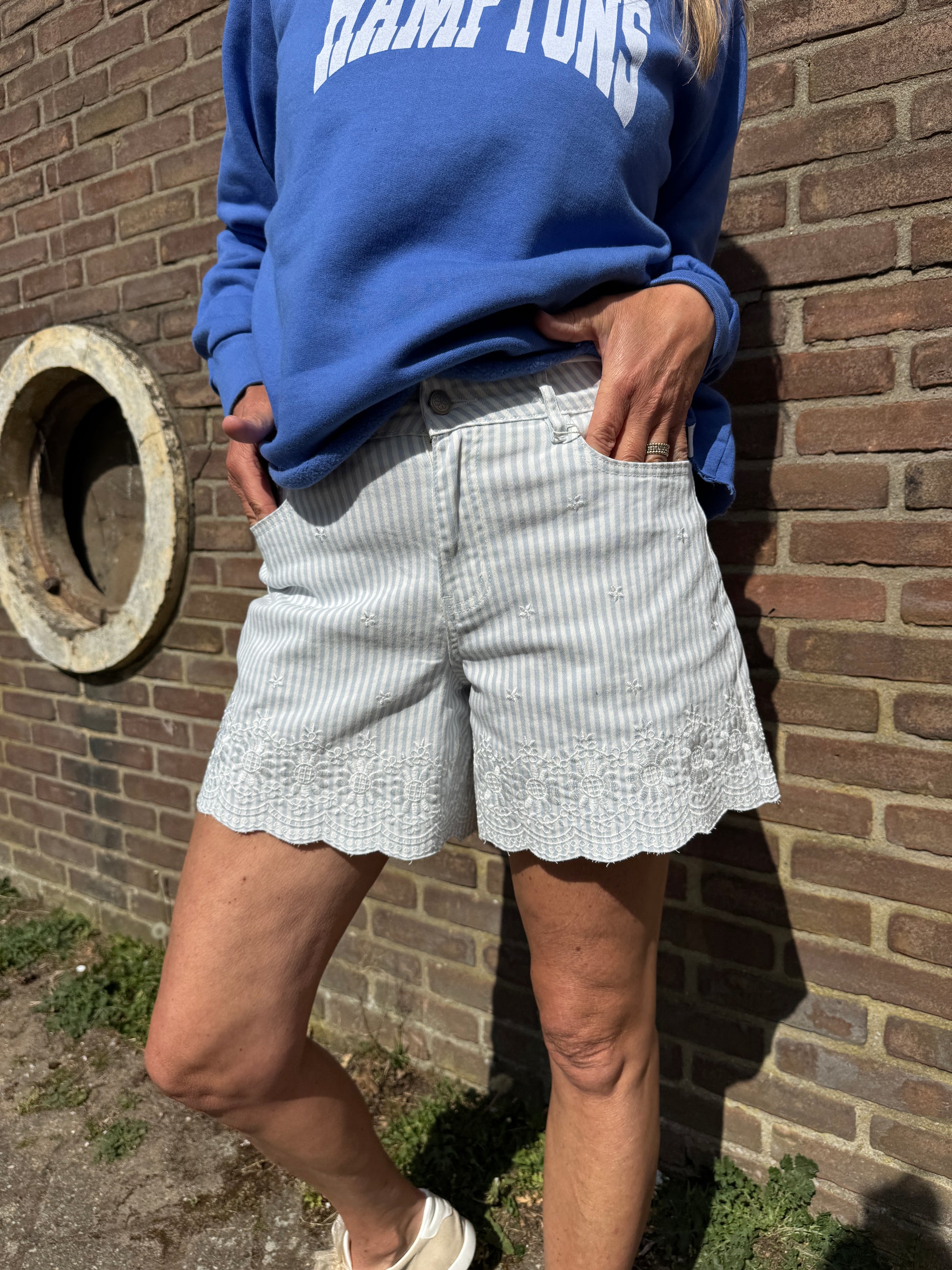 Dit te leuke shortje met lichtblauwe strepen en bloemendetails is echt een must-have voor de warme dagen. Het schattige afgeronde schulprandje maakt de short helemaal af!